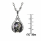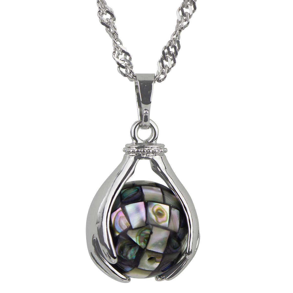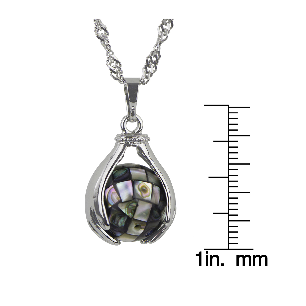 - Pendant is approx 1.25 inches long and .5 inches wide and features high polish silver toned hands holding a spinning mosaic abalone globe.