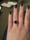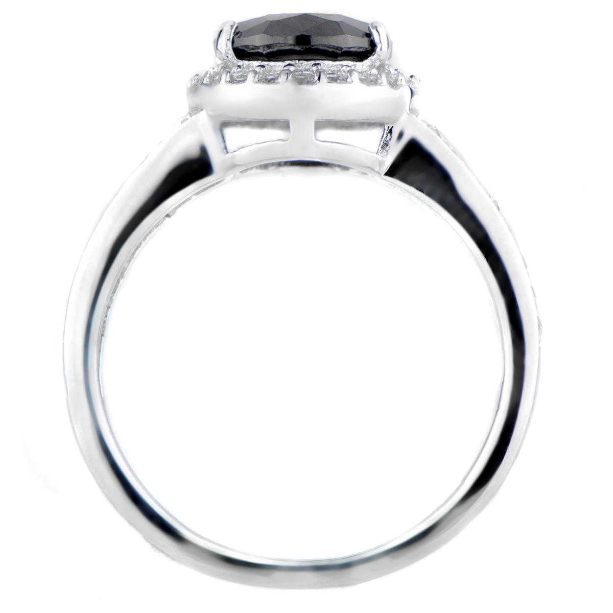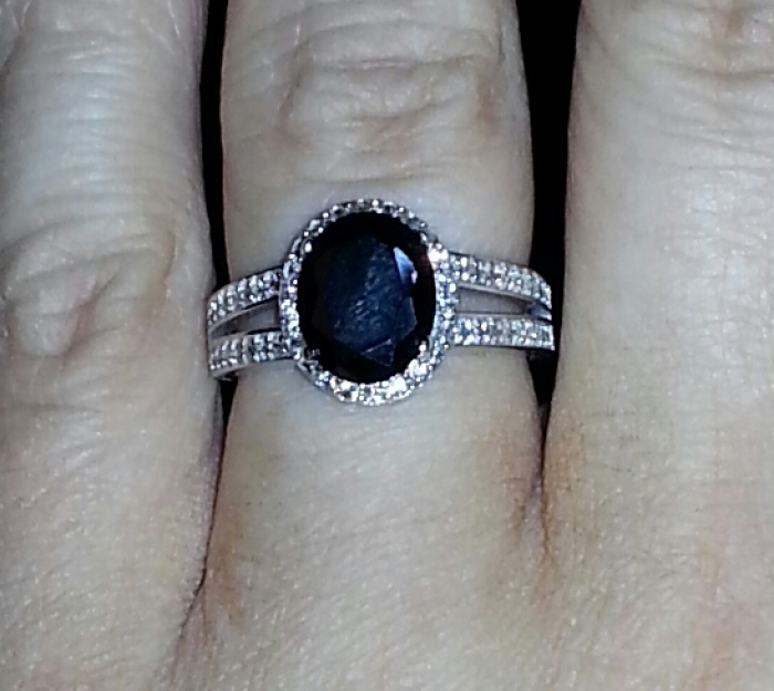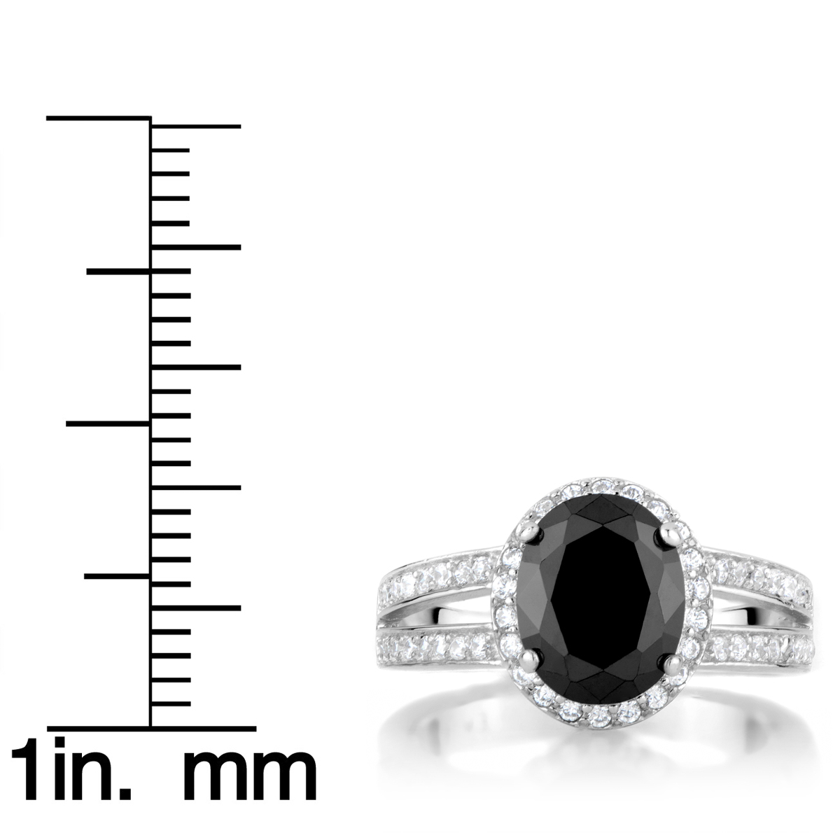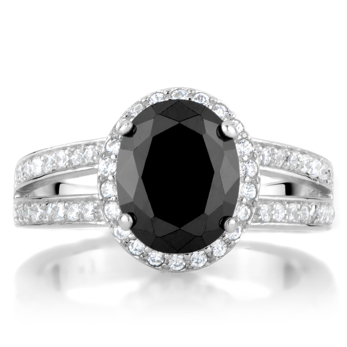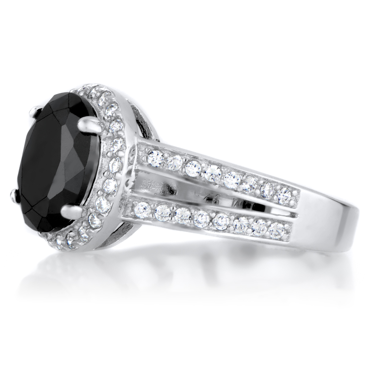 - Black oval cut CZ center stone measures 3 carats. Accent stones surround center stone forming a halo effect.