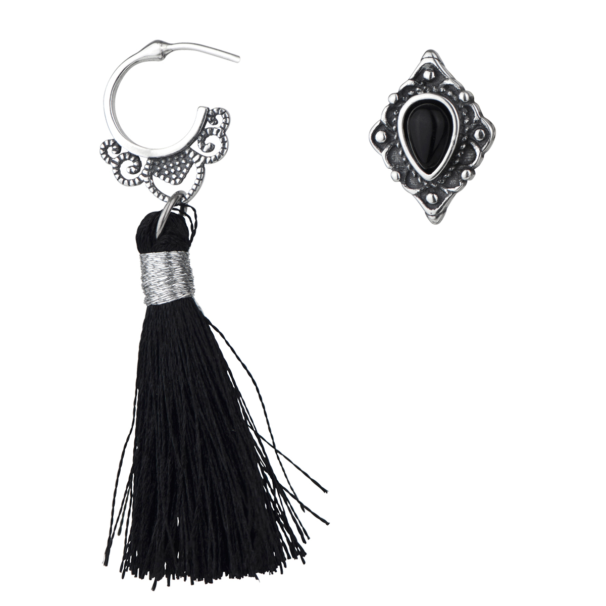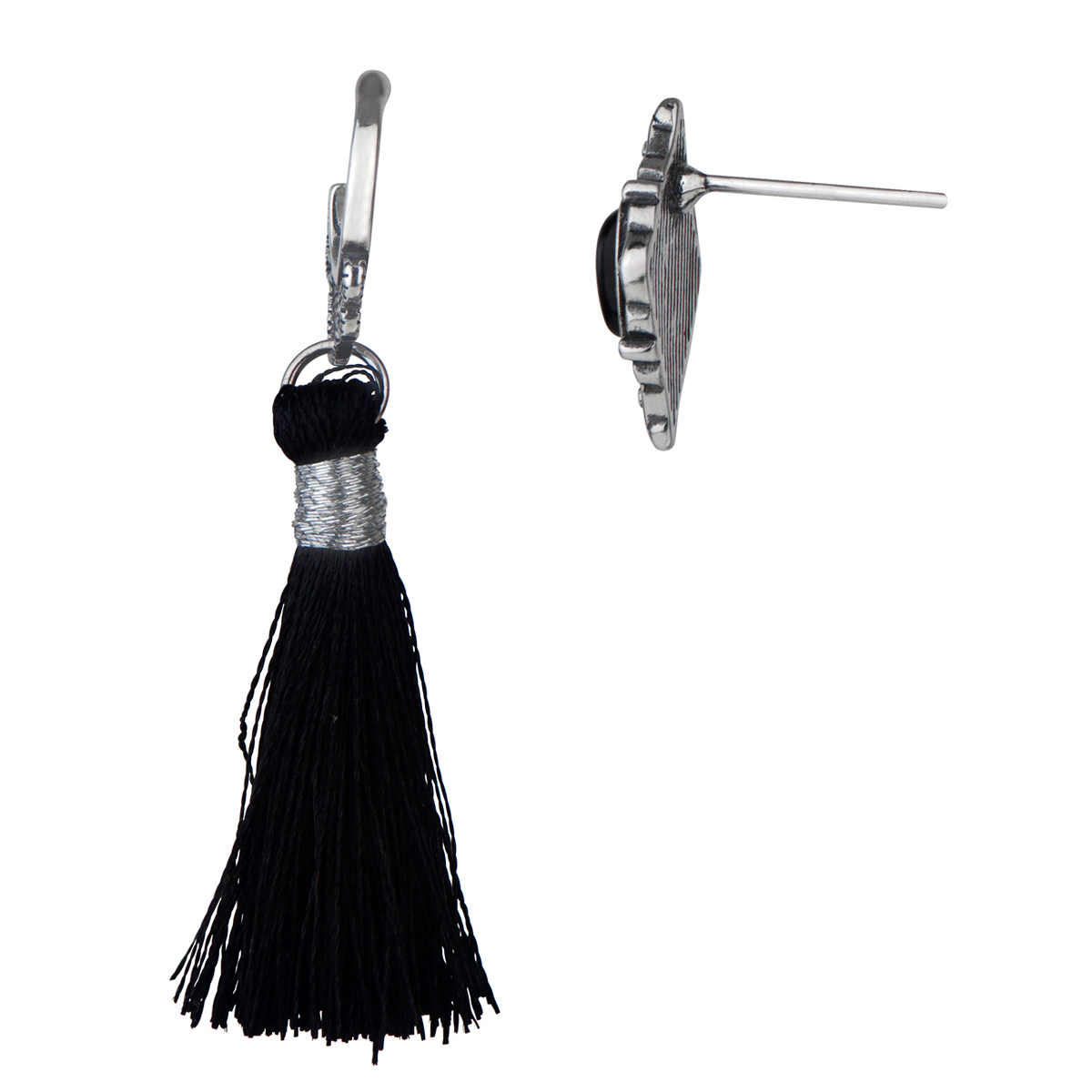 - Have fun with these Antique Black Tassel and Stud Mismatch Earrings.