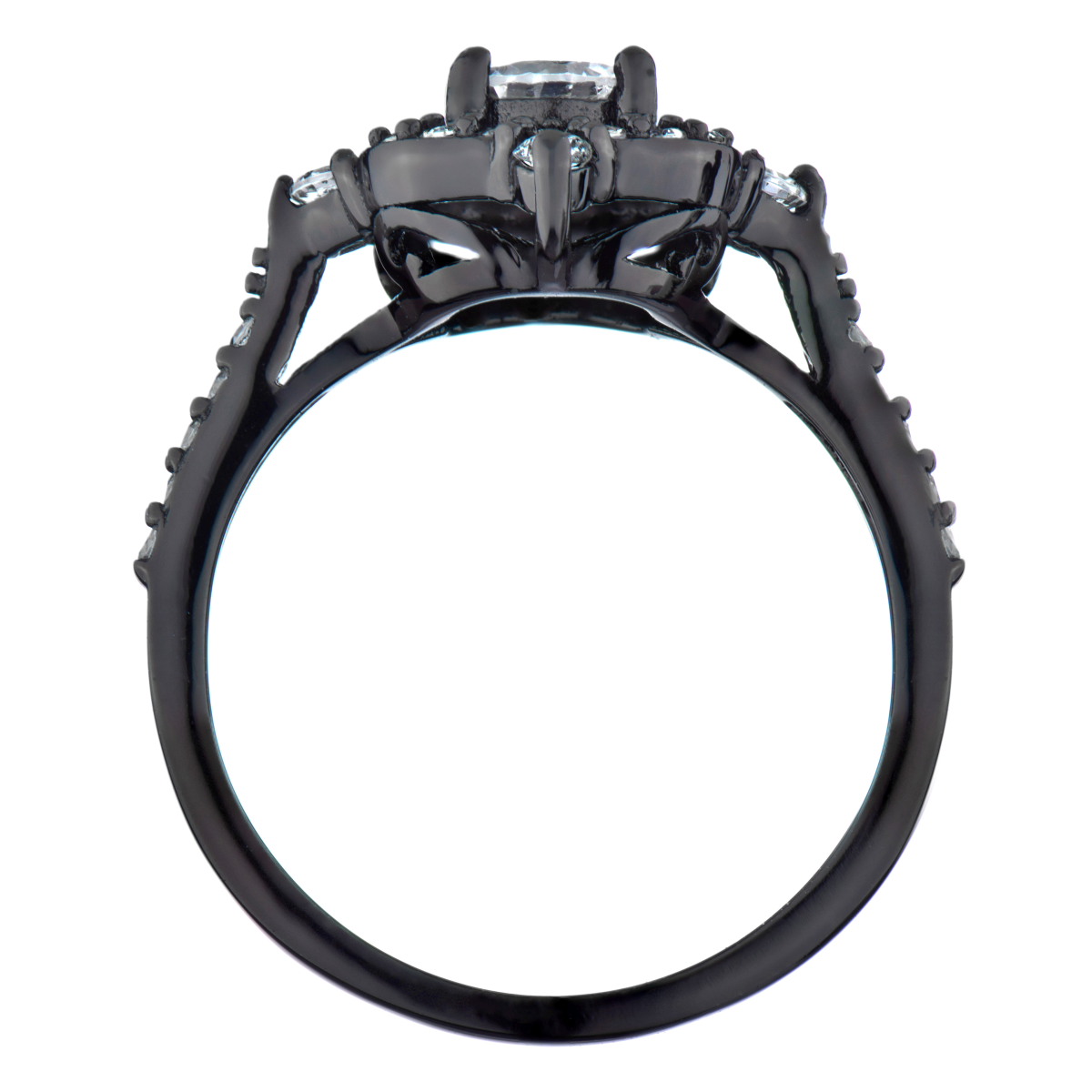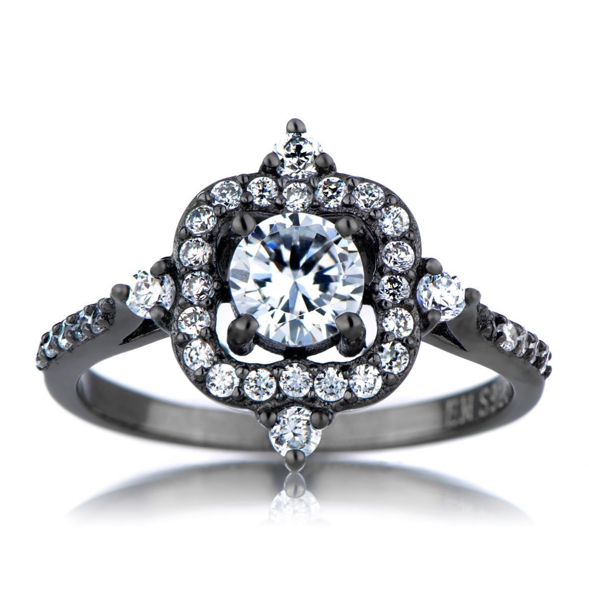 - The black rhodium plated, .925 sterling silver ring features round cut CZ stones throughout the design.