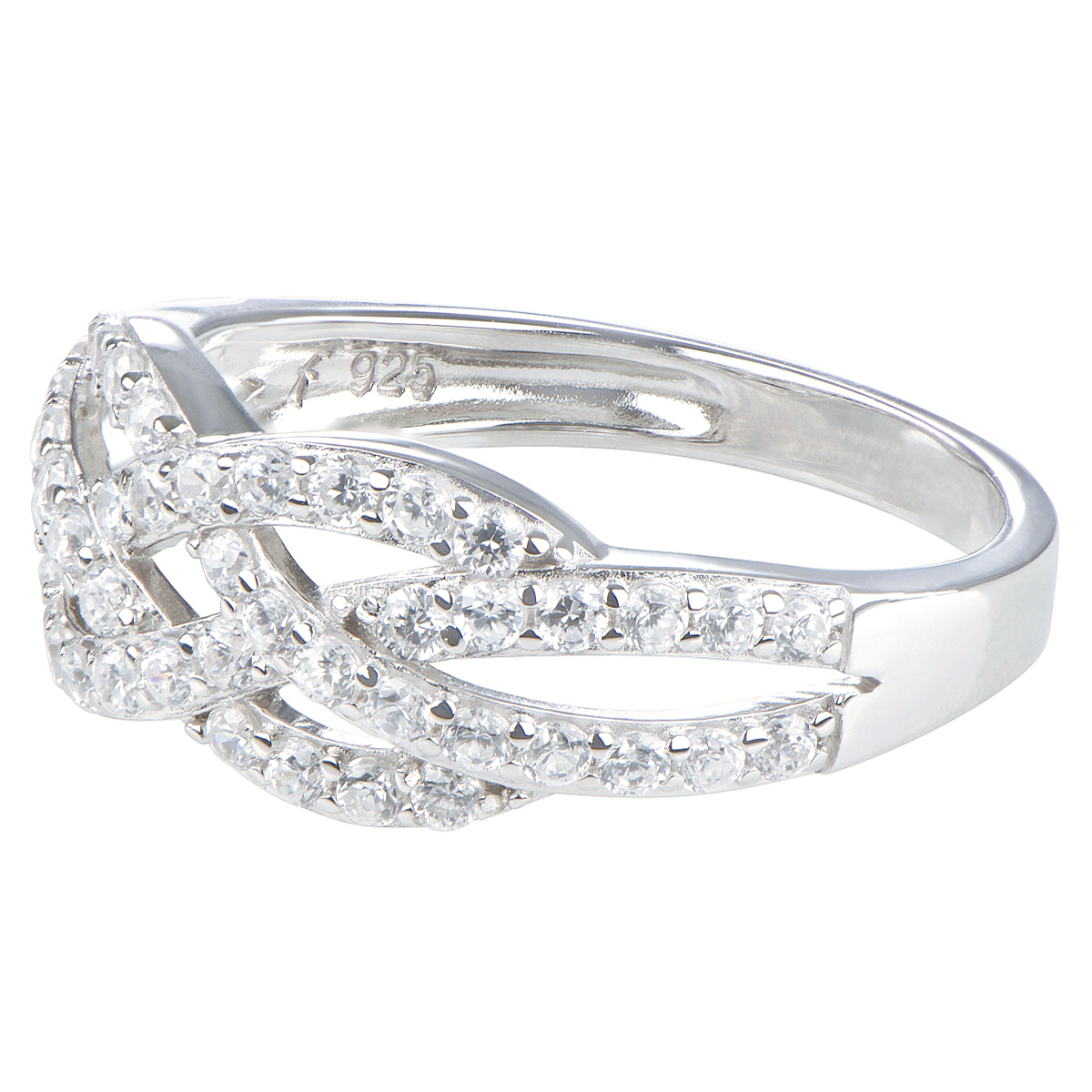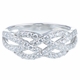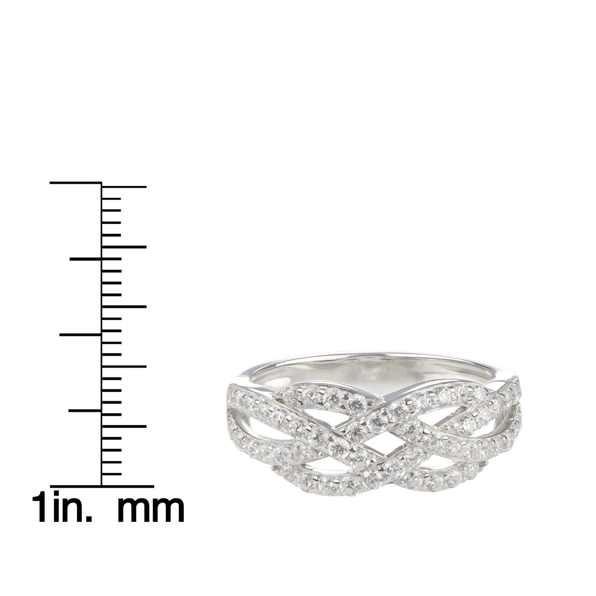 - This ring features a classic woven design with sparkling prong set cz's half way around the band for an elegant but simple look.
