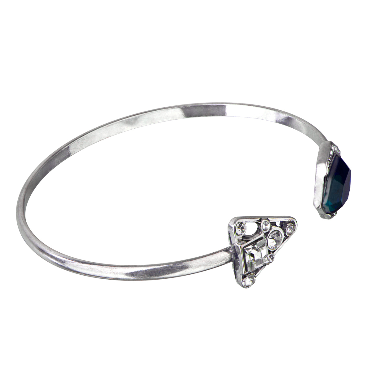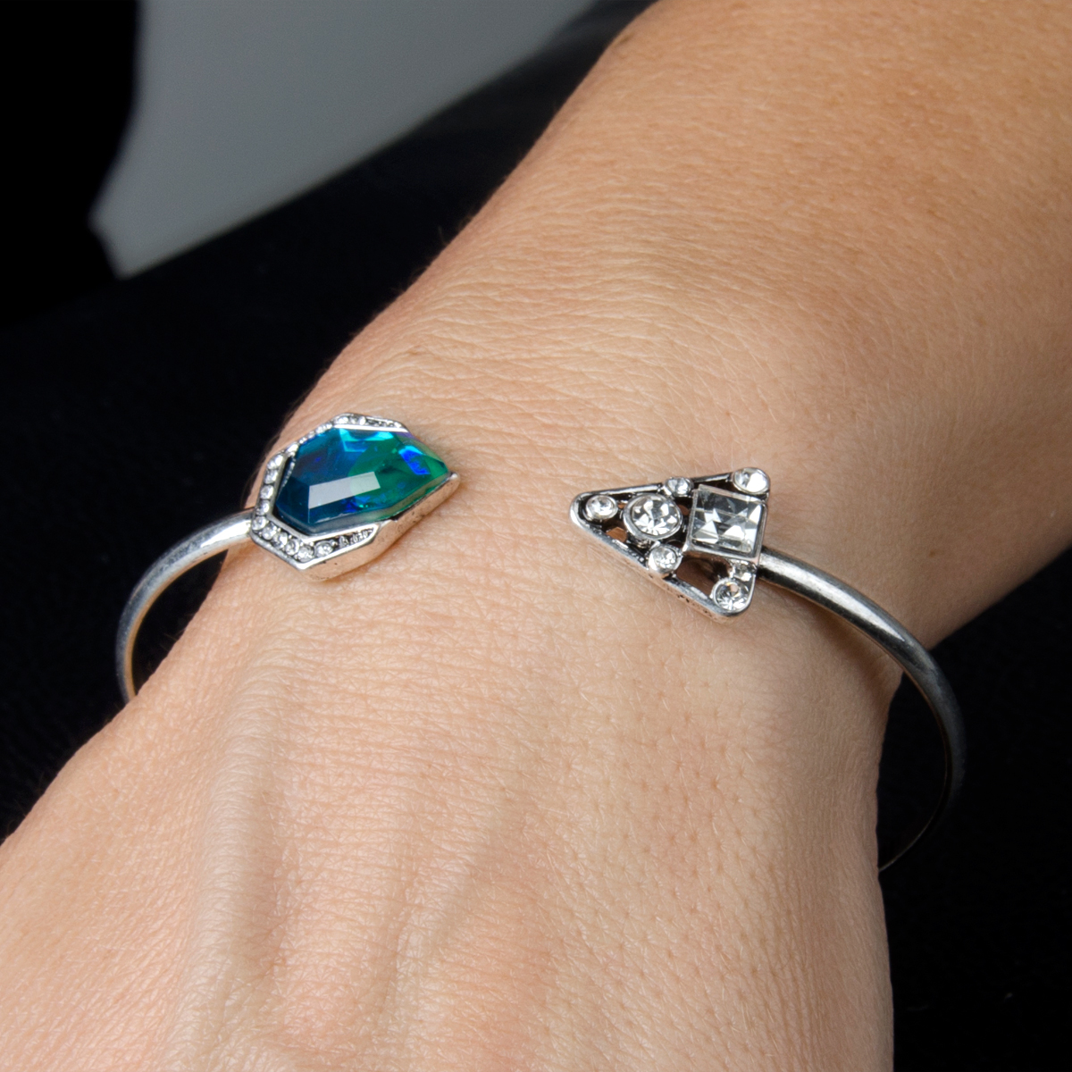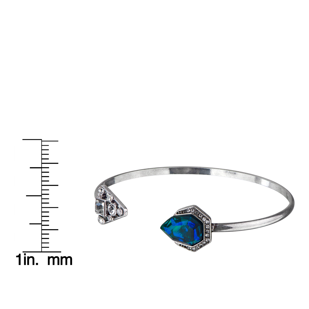 - The intricate details of this silvertone bangle bracelet and the eye catching blue/green crystal make this a unique addition to your collection.