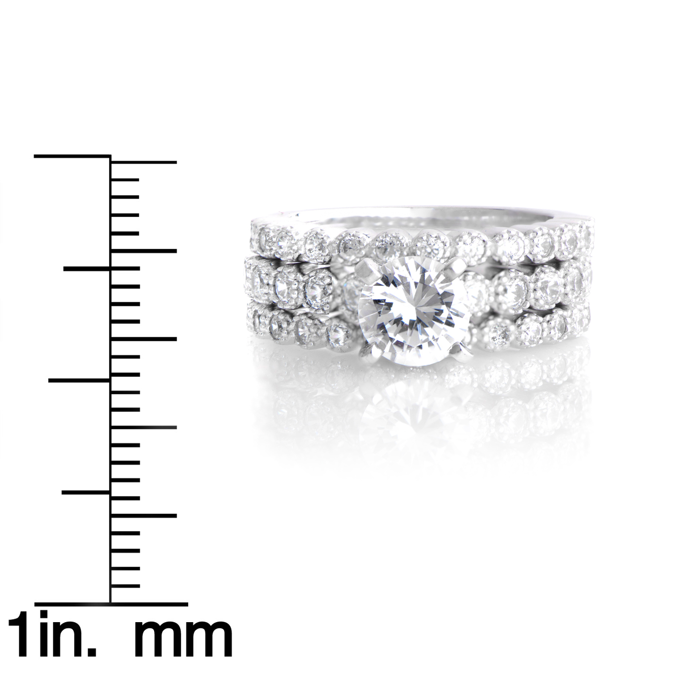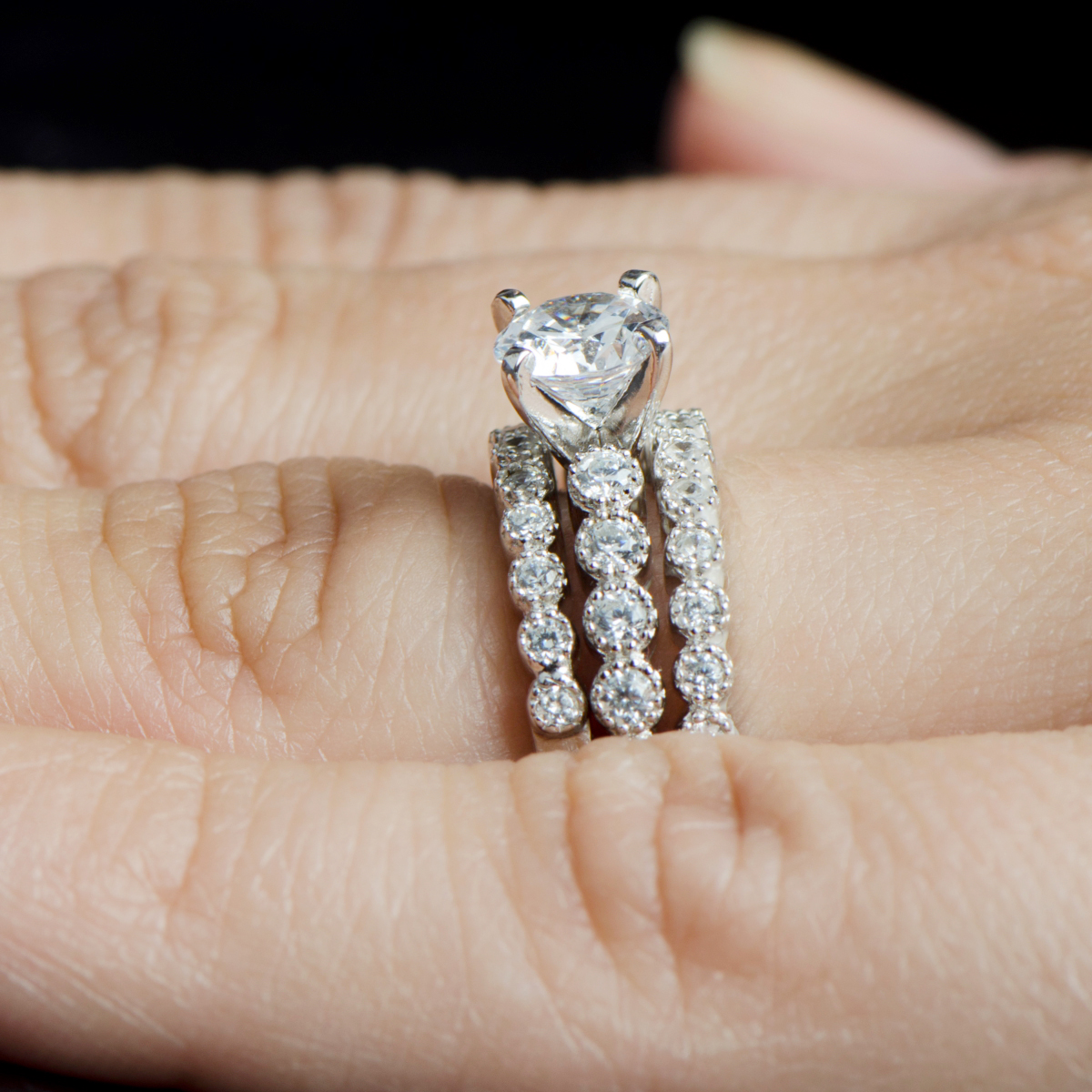 - The highlight of the trio set is the stunning .85-carat center stone. Each ring features smaller round cut CZs measuring .02-carats.
