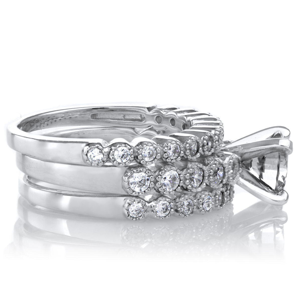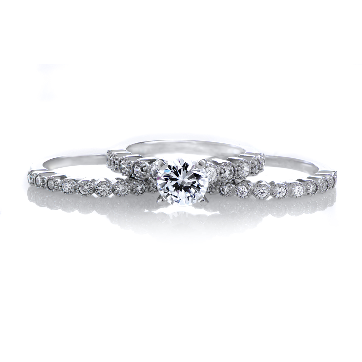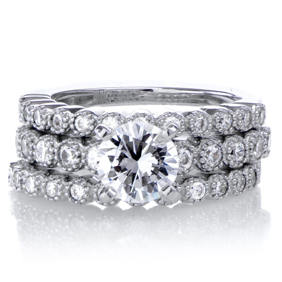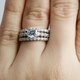 - The .925 sterling silver wedding ring set features three stunning rings that are full of brilliant round cut CZ stones.