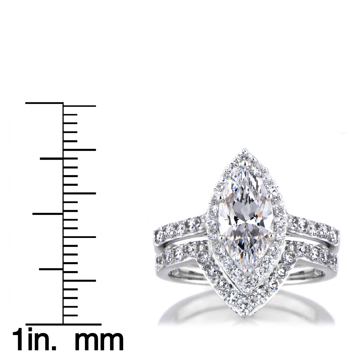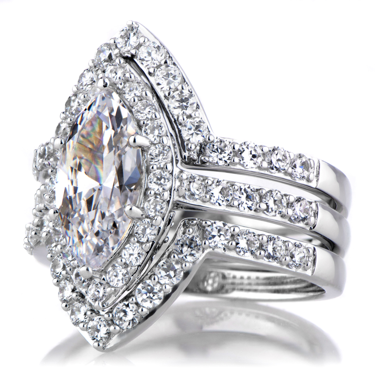 - .925 sterling silver, rhodium plated ring features a stunning 2.5-carat marquise cut center stone.