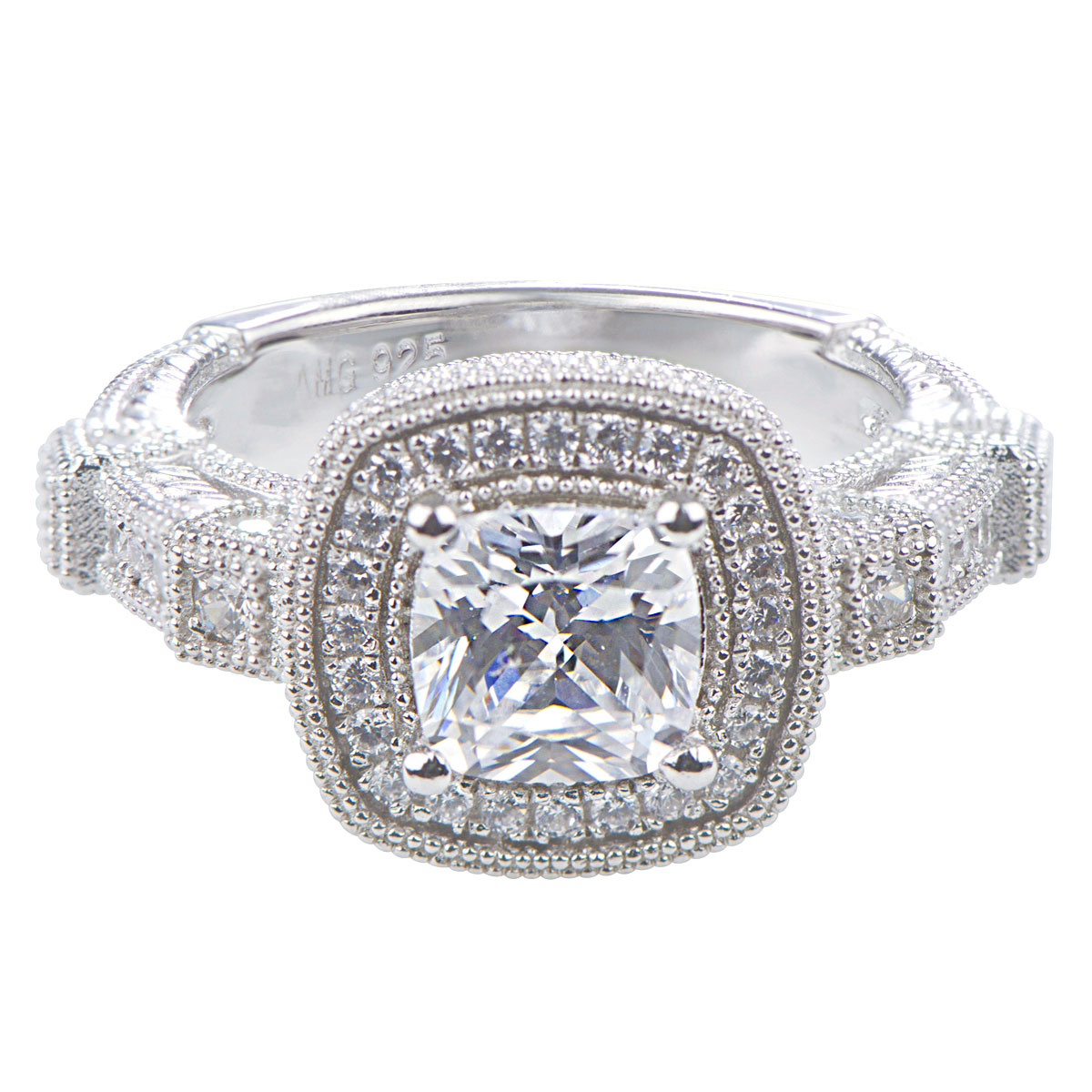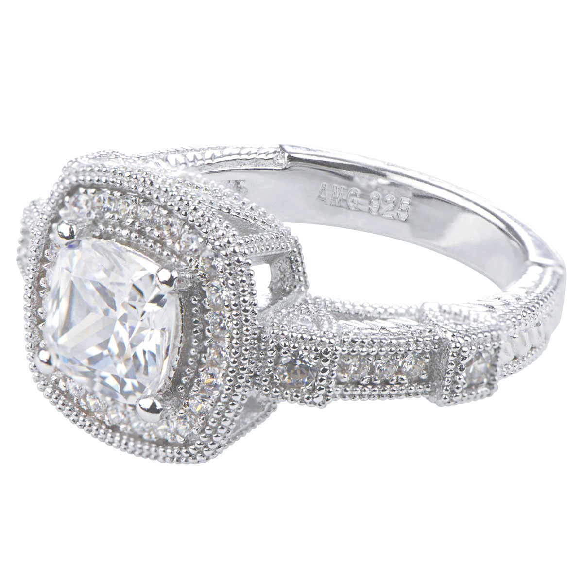 - This ring features intricate beaded detail on the band with pave set cz's and a 1.03 carat cushion cut center stone framed by even more cz's and beaded detail around the edge.