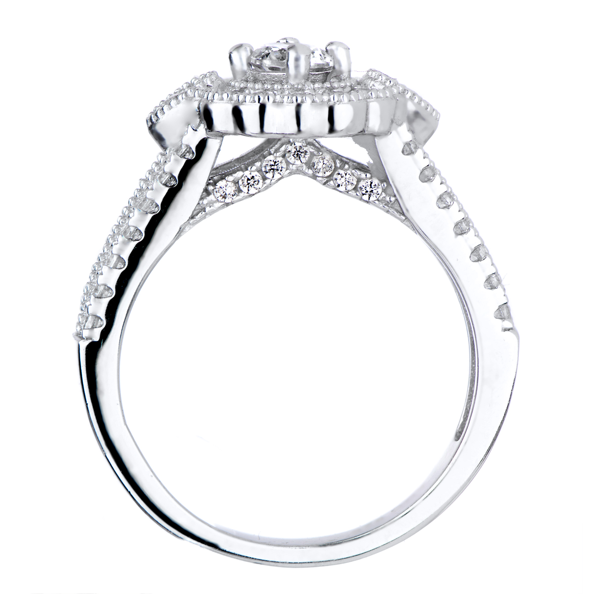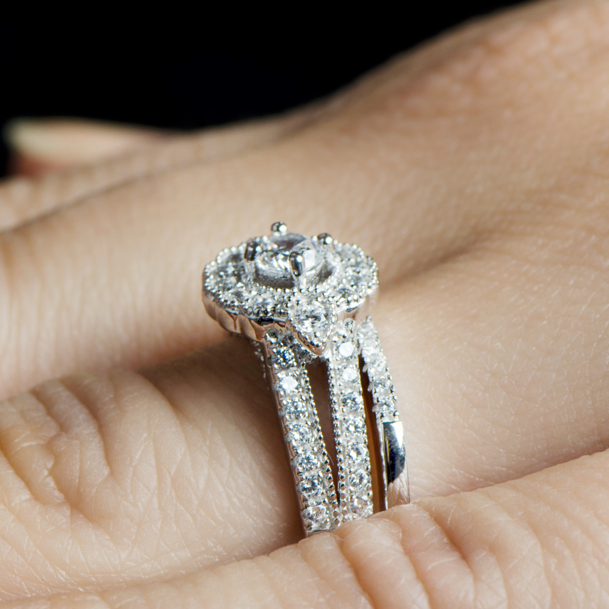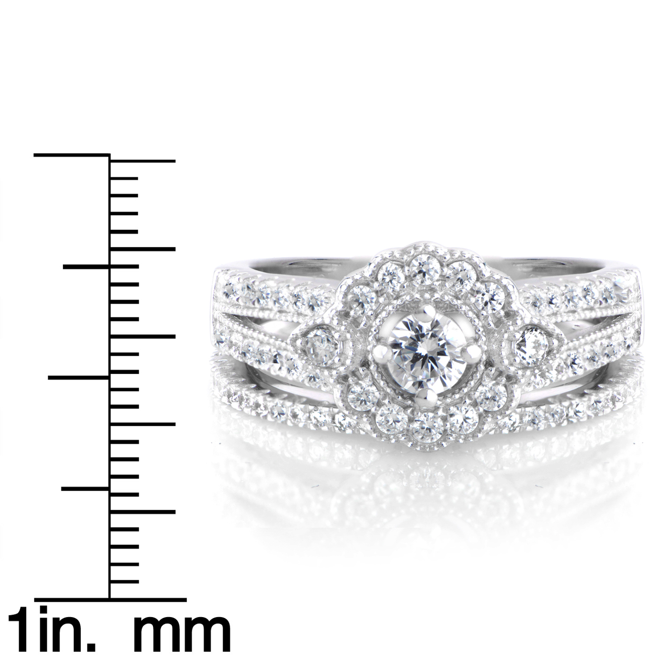 - This unique .925 sterling silver wedding ring set features a split band engagement ring with a stunning art deco inspired floral center.