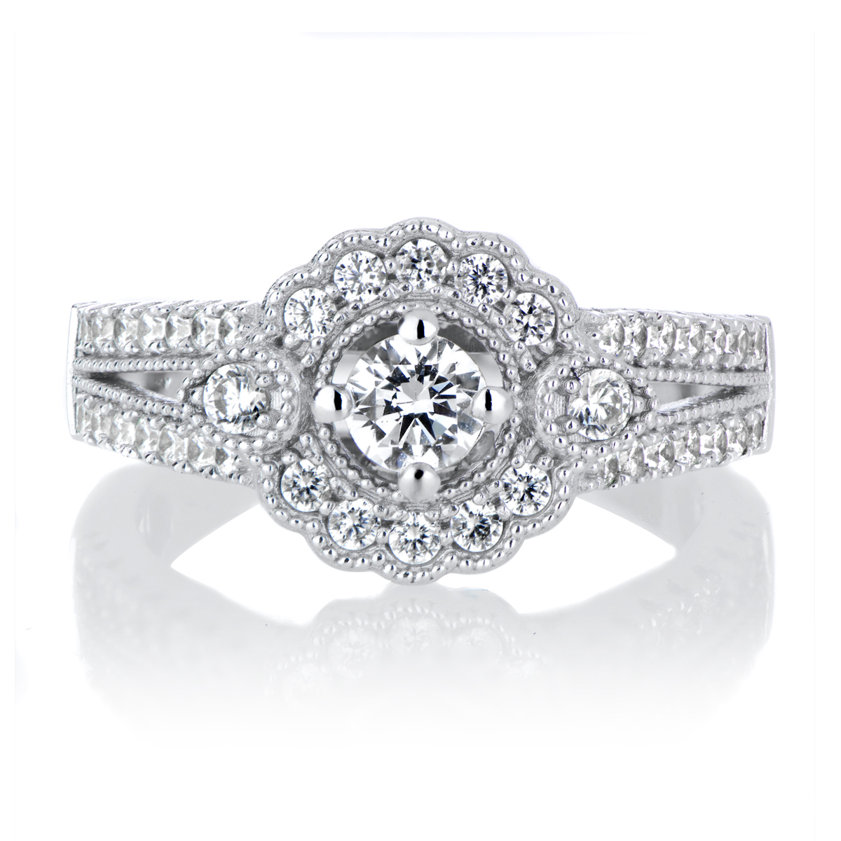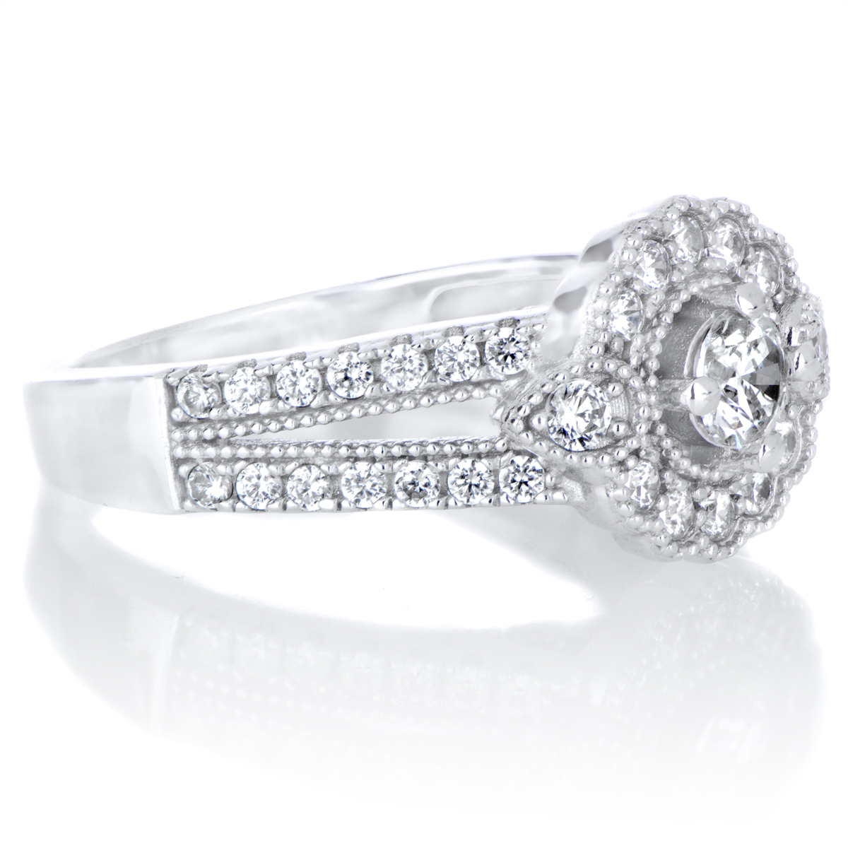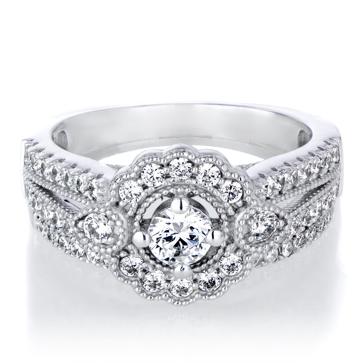 - This unique .925 sterling silver wedding ring set features a split band engagement ring with a stunning art deco inspired floral center.