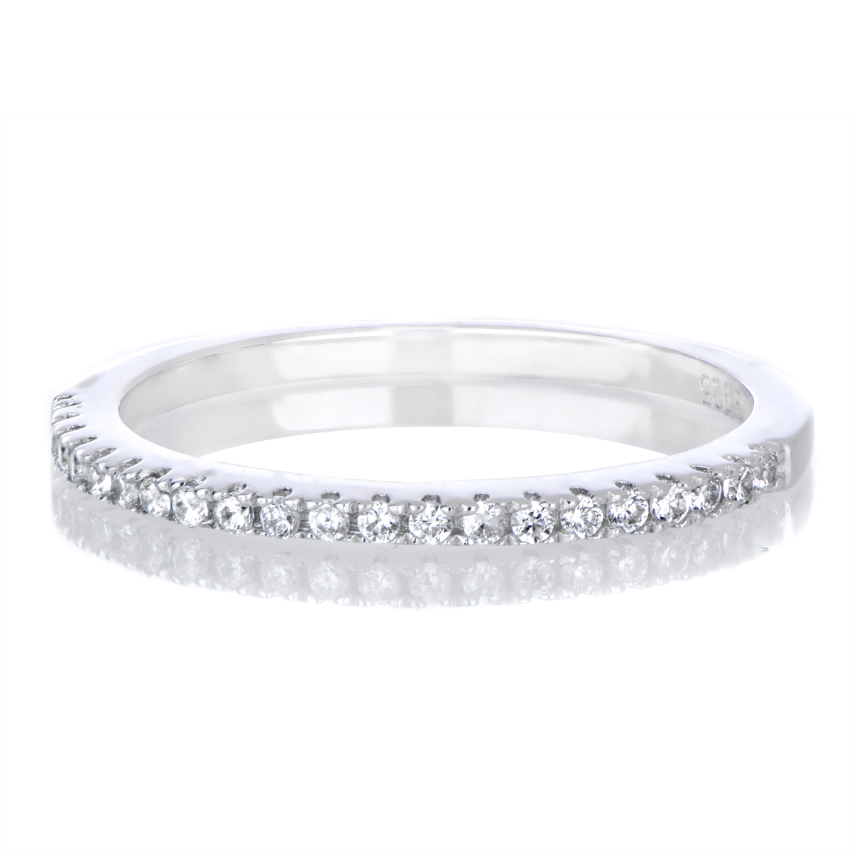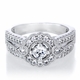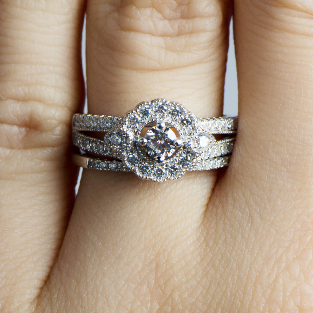 - The engagement ring features a stunning round CZ center surrounded by smaller size CZ stones. The ring guard complements the engagement ring perfectly and features CZ stones.