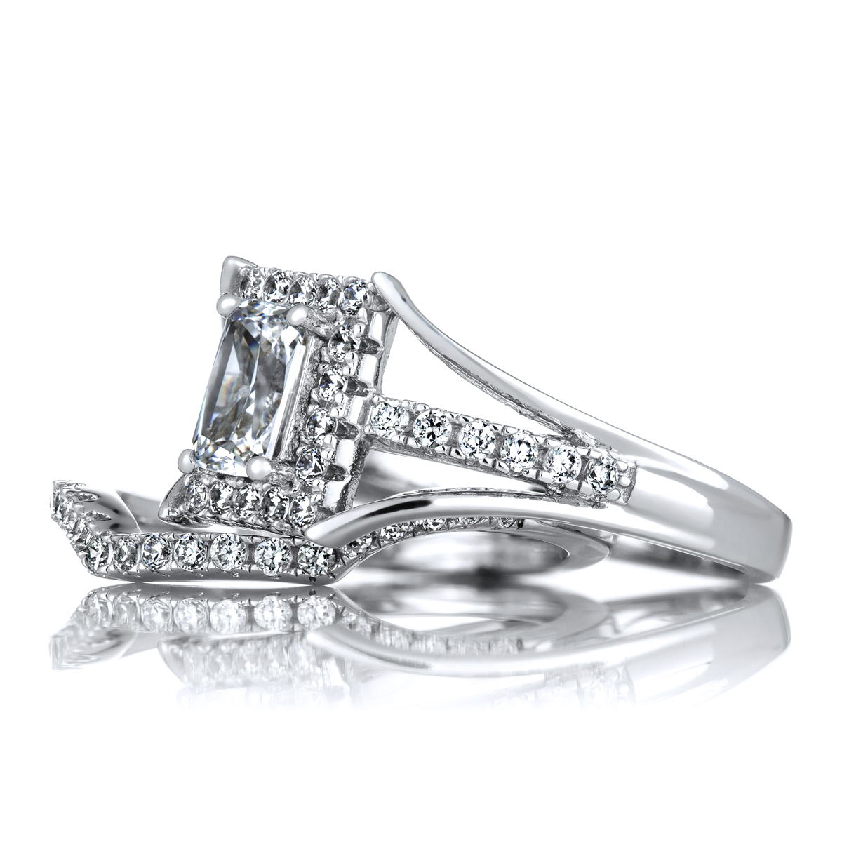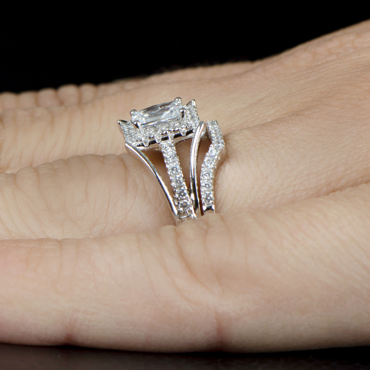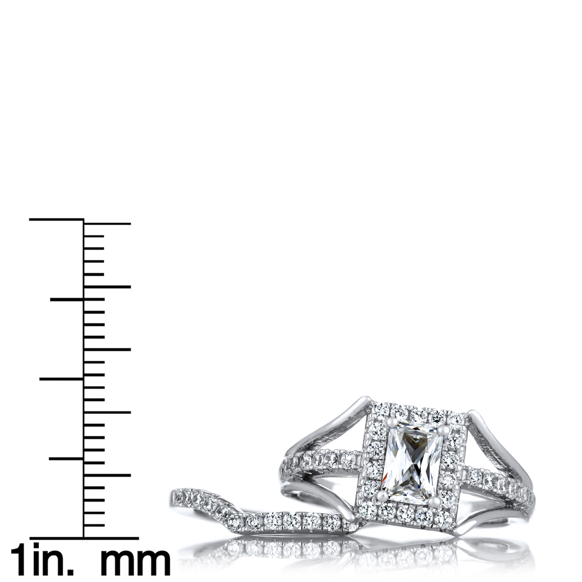 - Adorn your finger with a modern work of art with Peppin's Halo Emerald Cut CZ Wedding Ring Set.