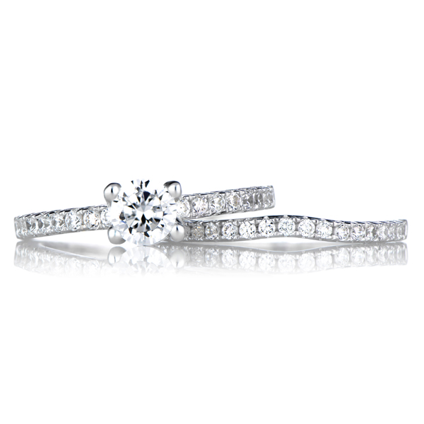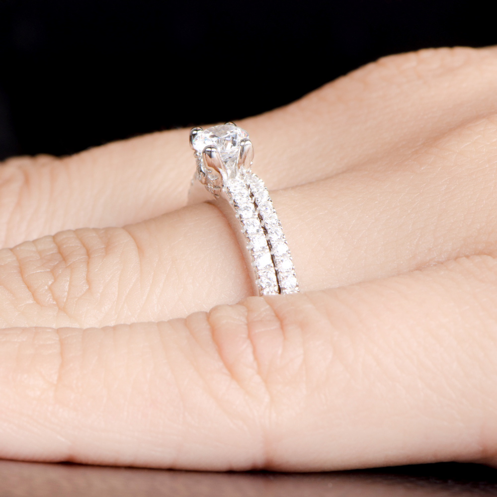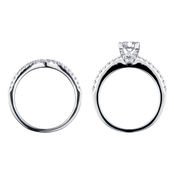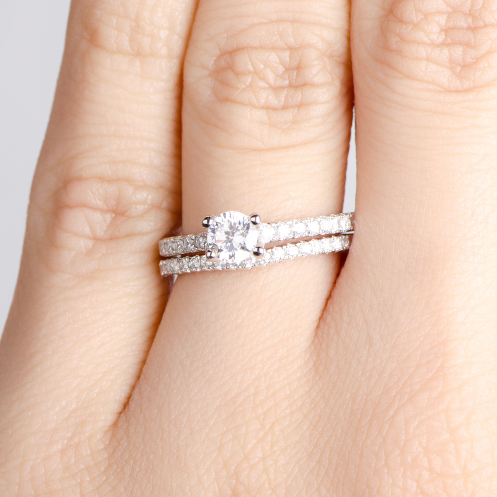 - The engagement ring sits flush with the CZ ring guard, making it the perfect wedding ring set.