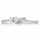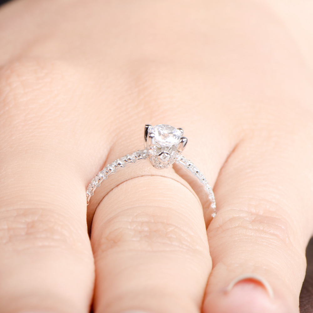 - The stunning center stone is round cut and measures .5-carats and features tiny CZs that go halfway down each side of the ring.