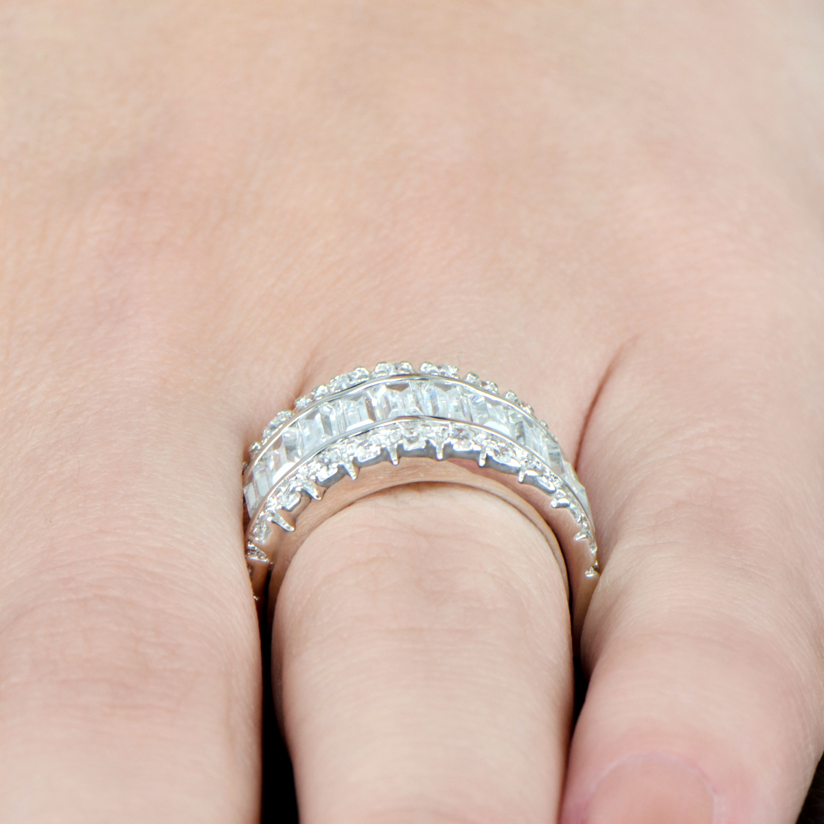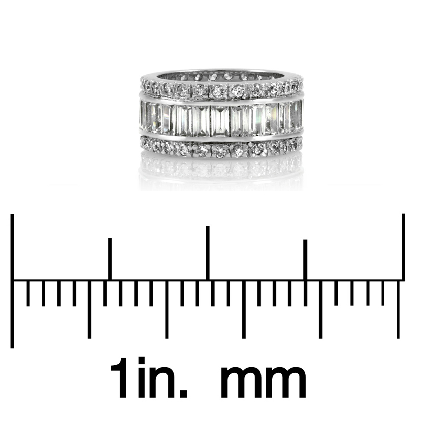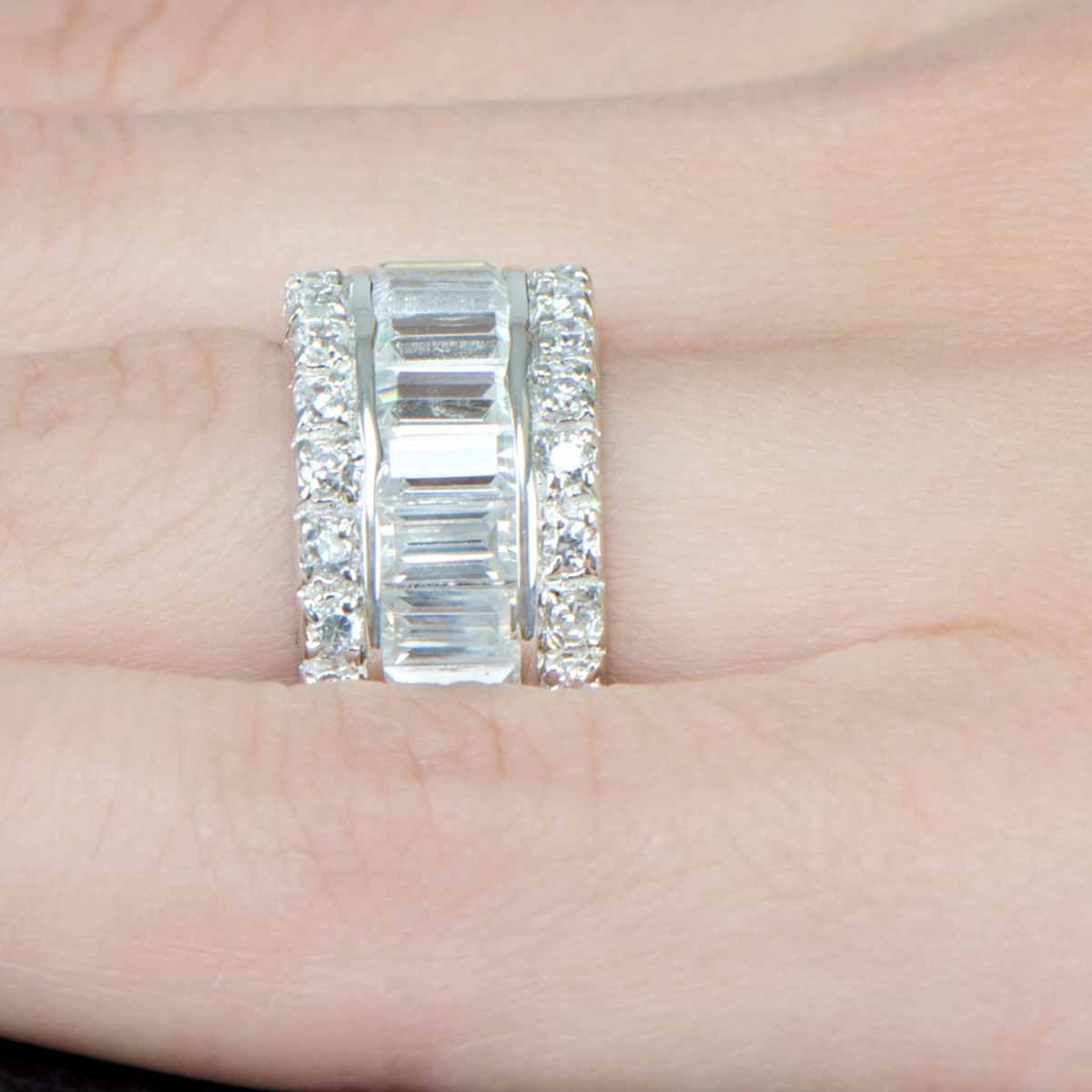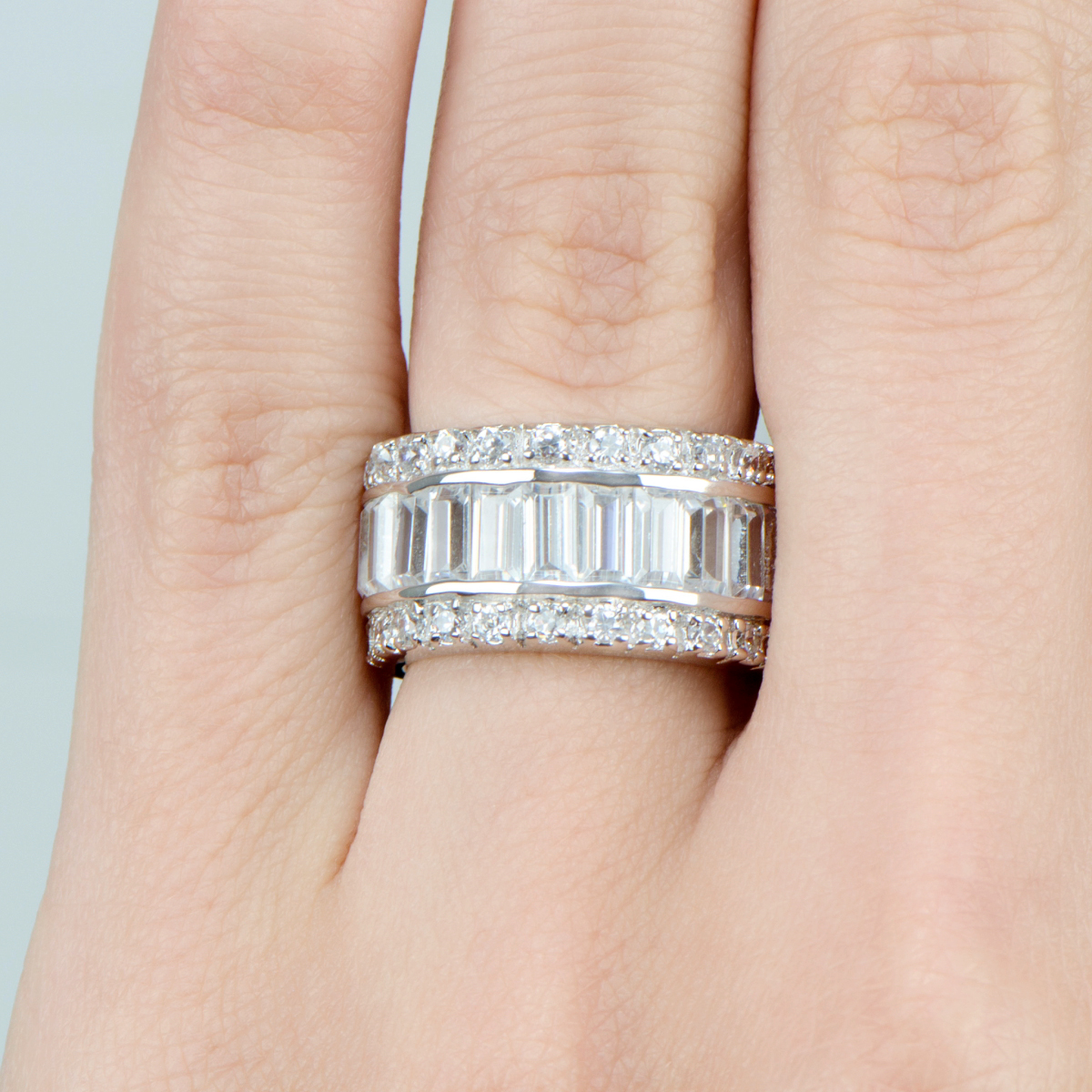 Emerald Cut CZ's in a channel setting are sandwiched between brilliant round cut cz's for a dramatic and stylish look.