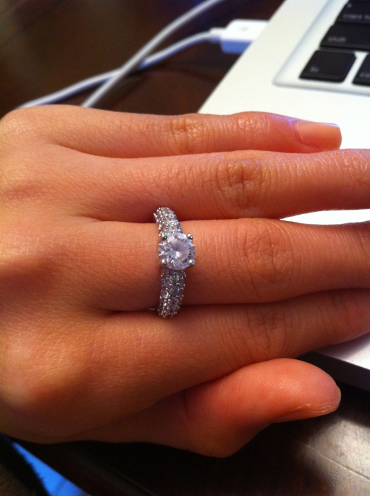 I just got this as an engagement ring and it is fabulous. Most people can't tell it's a faux diamond. The size of the center stone is very believable!! I've caught myself staring at it MANY times. I've gotten lots of compliments on it. It's definitely an eye catcher!