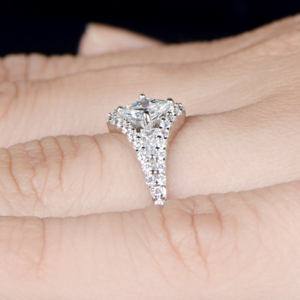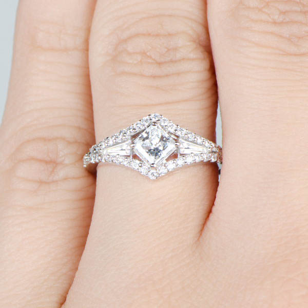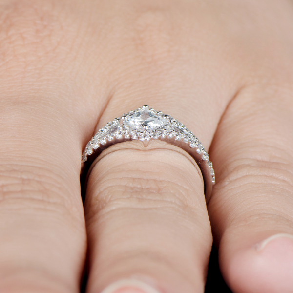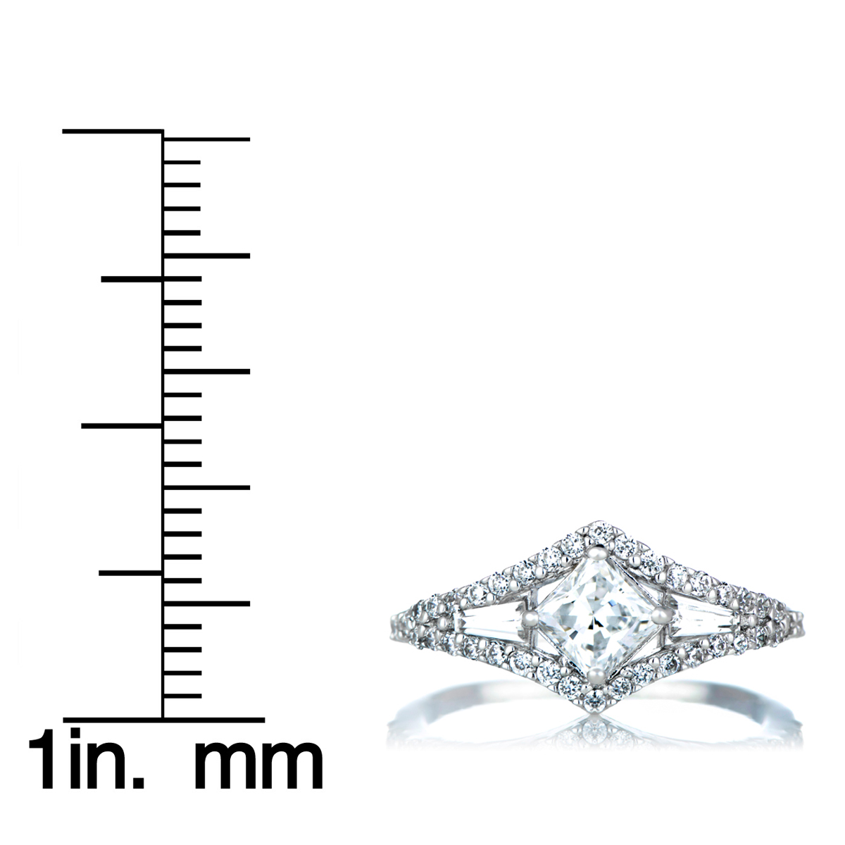 - Features a AAAAA (5A) signity CZ center stone. Center stone is princess cut and measures .59 carats, surrounding stones measure .02 carats.