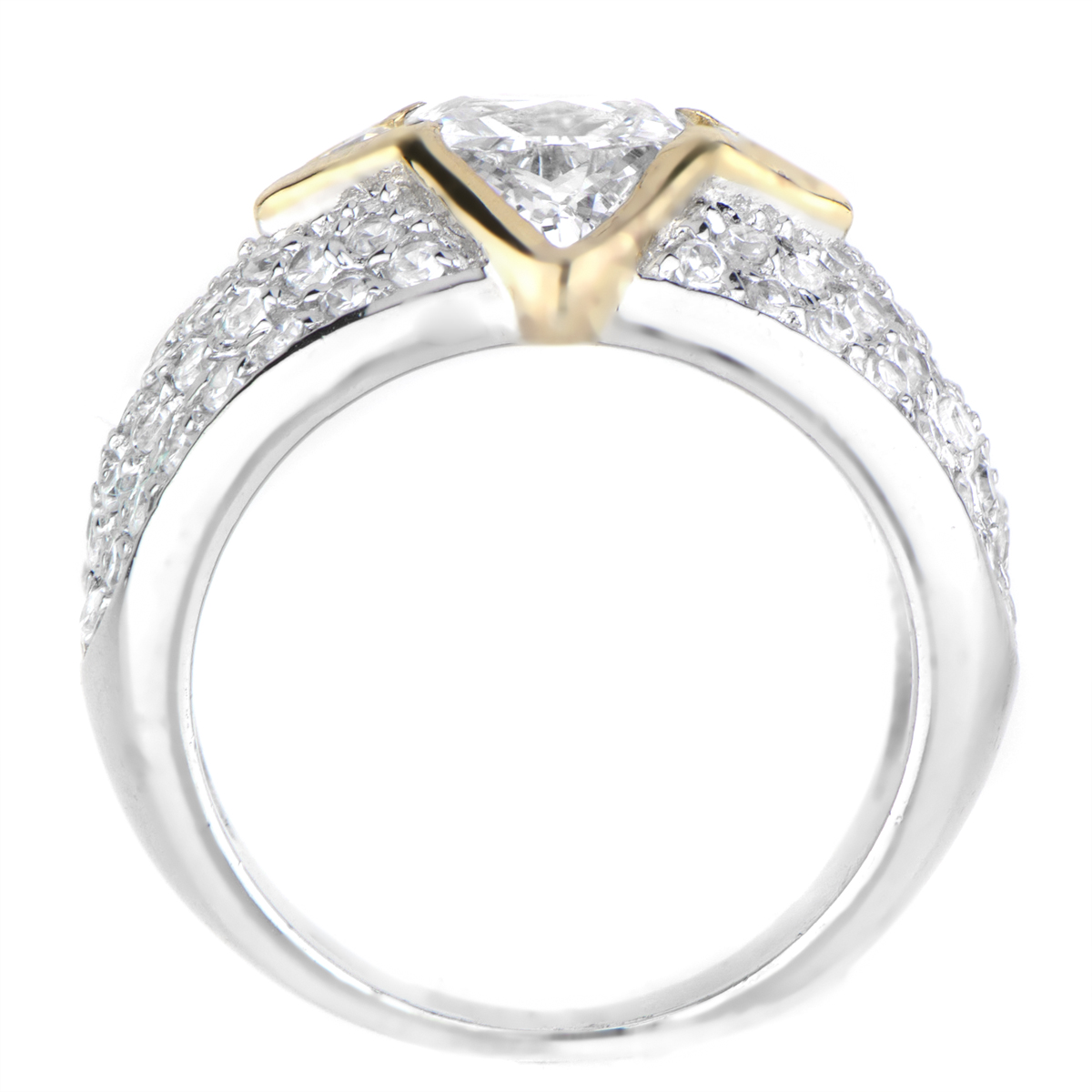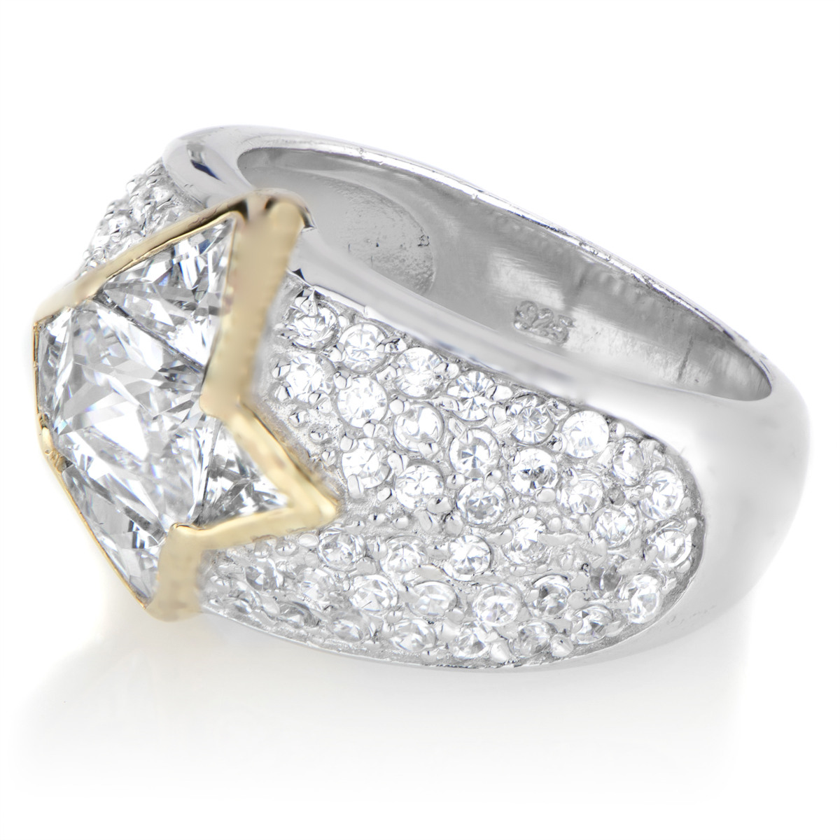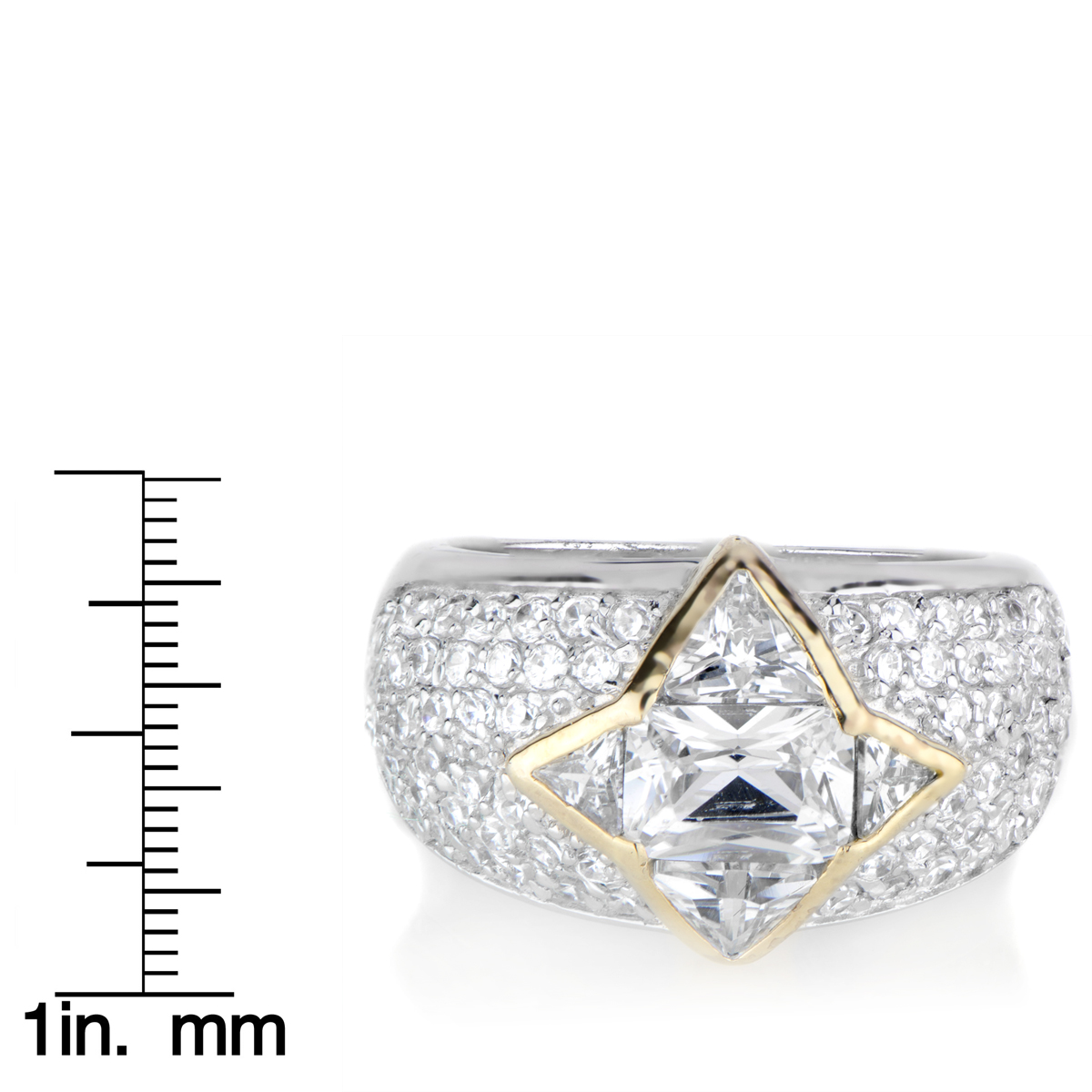 Luxurious-like engagement ring with one-carat, emerald cut center stone and pave set stone band. Goldtone shaped border forms a star-shape design center.