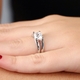 - Medium width sterling silver band splits on either side and forms the four prongs that hold the center stone in place.