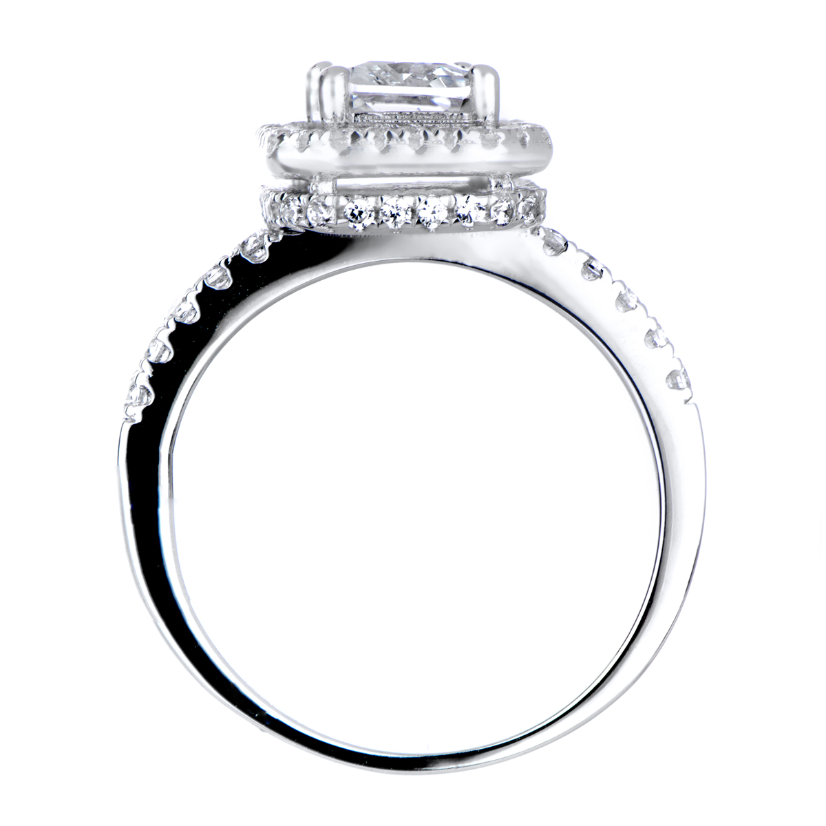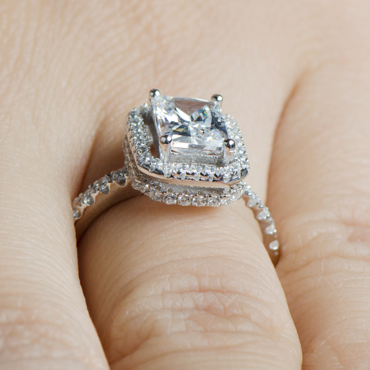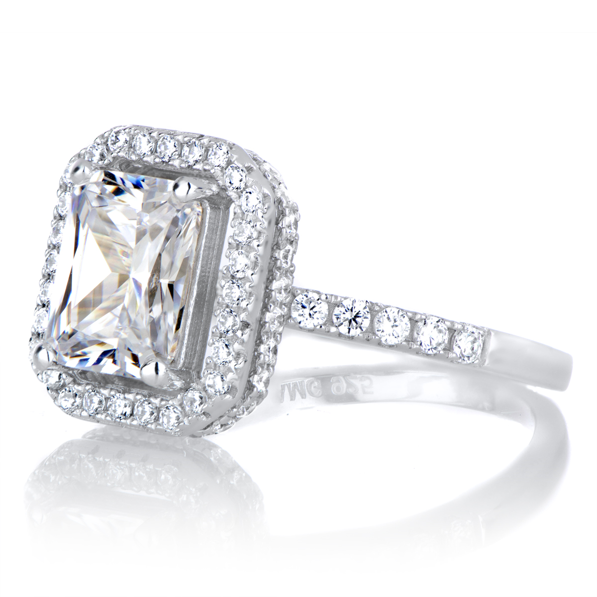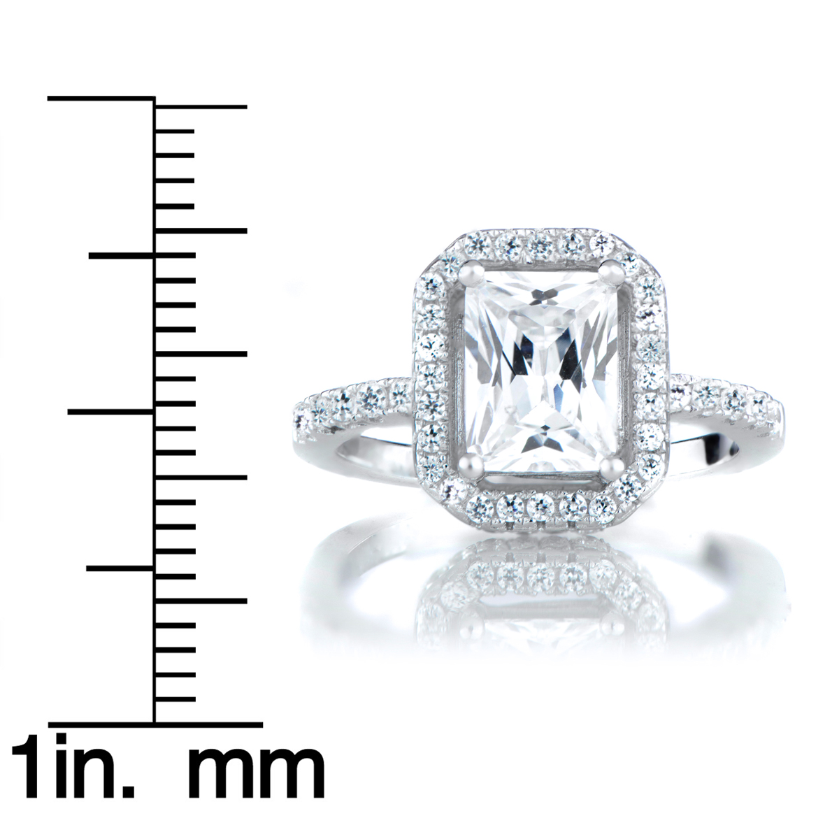 - The .925 sterling silver ring features a bold Emerald Cut 3.5-carat CZ center stone surrounded by a halo of small round cut CZs.