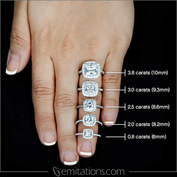 - BELIEVABLE - Traveling? This cushion halo ring is the perfect replacement for your real diamonds, customers tell us that no one will know the difference! Put this ring on and just wait for the compliments to start flowing! The center stone in this halo ring measures 8mm which is approximately 2.04 carats. The cushion cut shape adds just the right feminine touch while the surrounding round cut cz stones are approximately .25mm providing maximum sparkle.