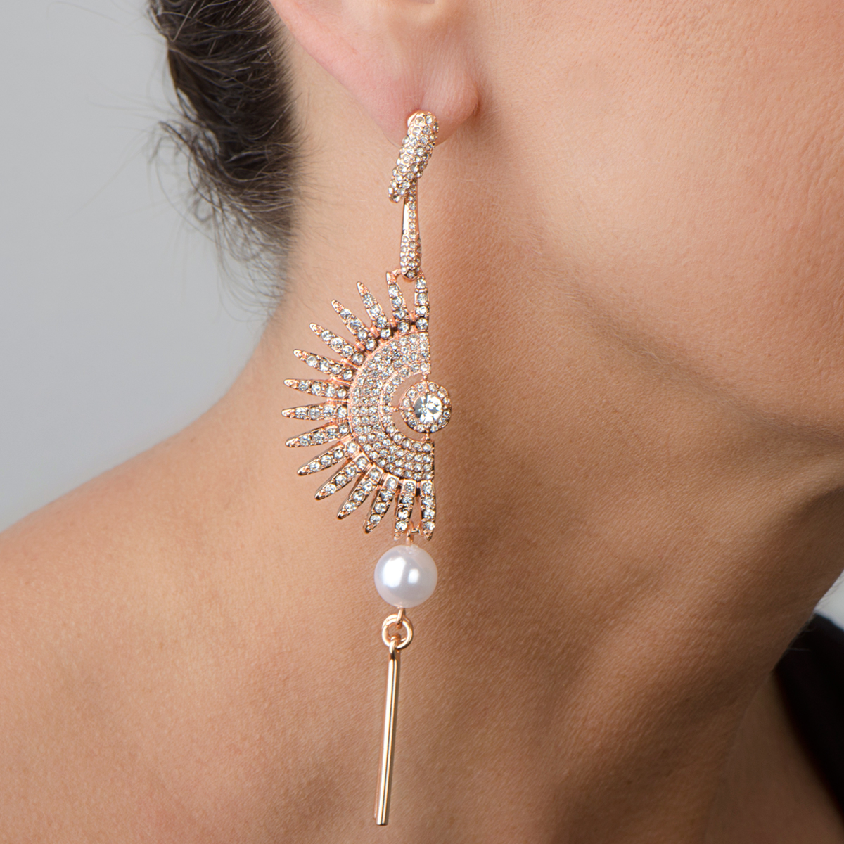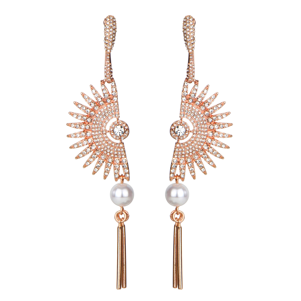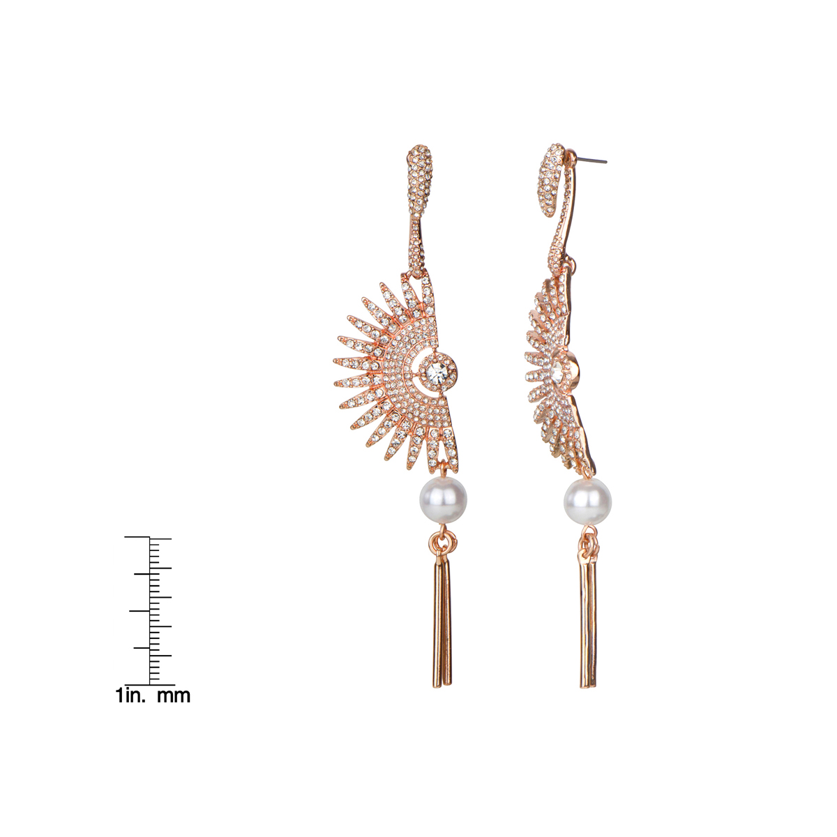 - Dance all night with these fan shaped rose goldtone crystal and faux pearl drop earrings.