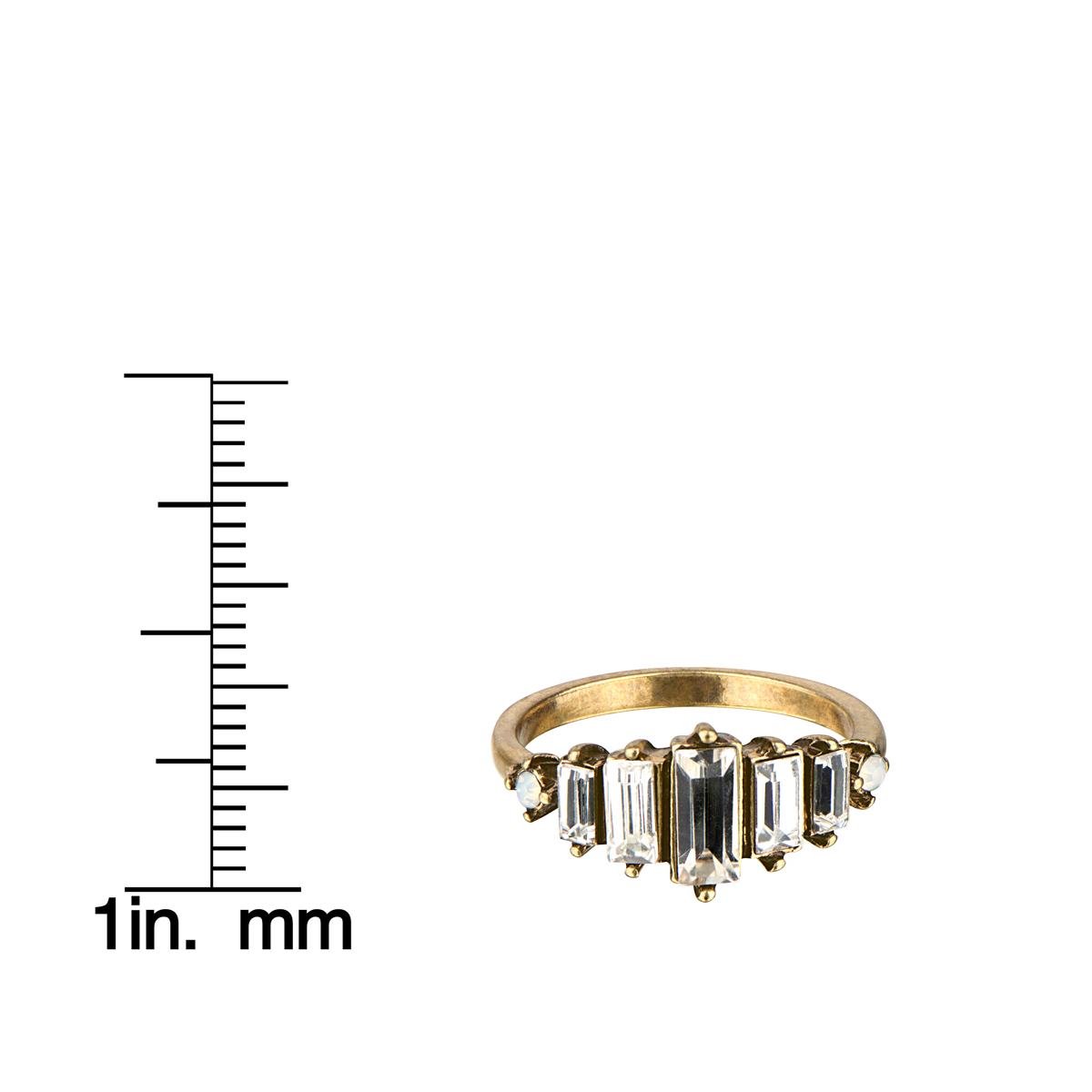 - This ring gives an art deco vibe with its graduating step cut rhinestones and antique gold patina.