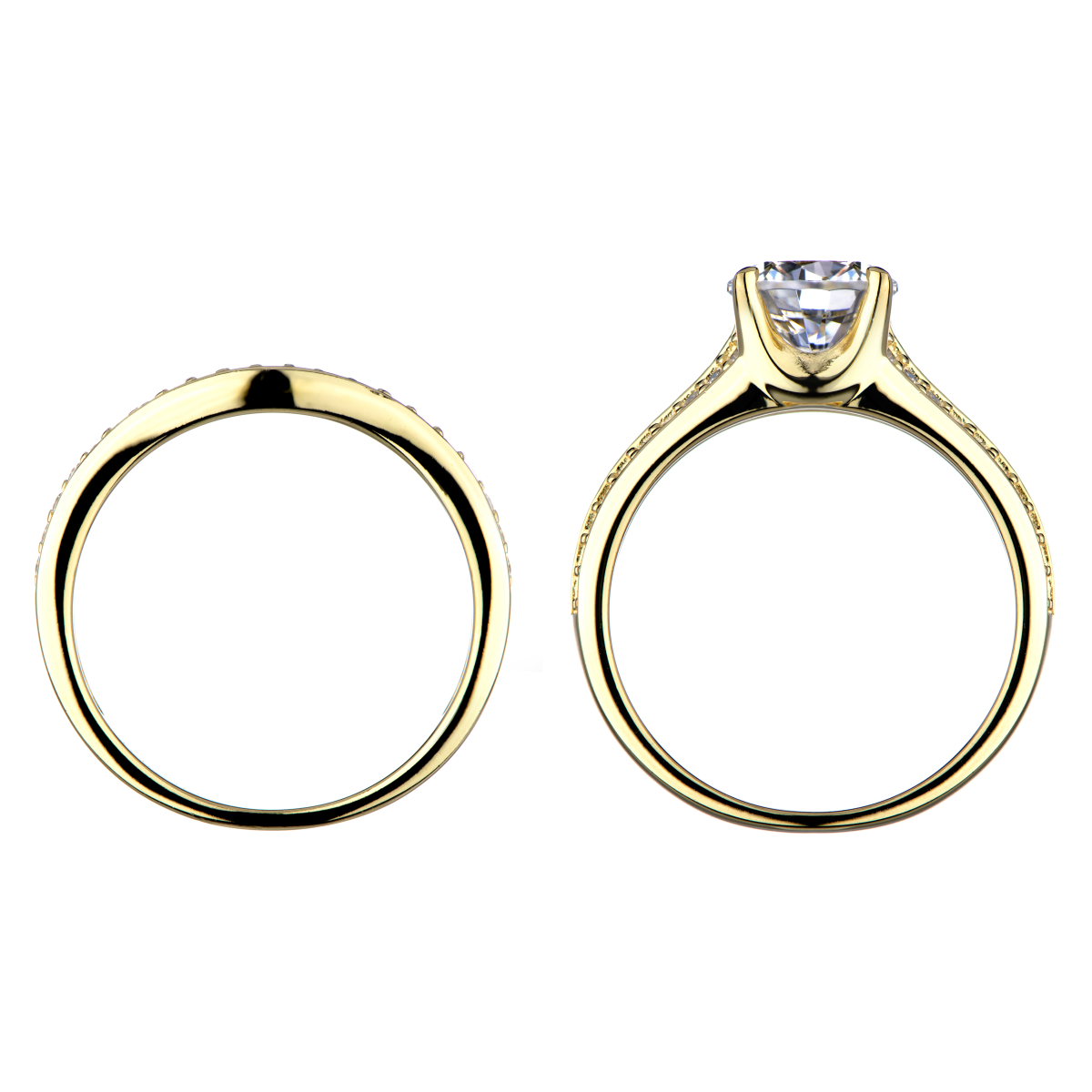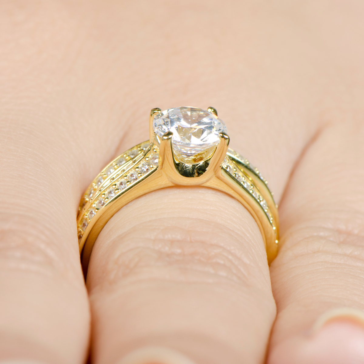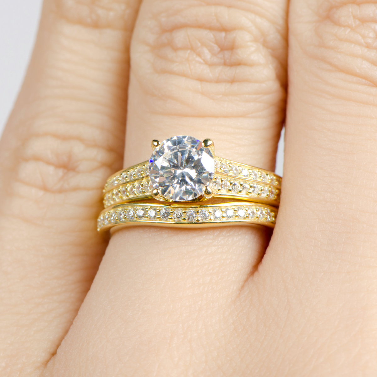 The sterling silver, goldtone ring set features stunning CZ stones throughout each ring. Cubic Zirconia ring. Sterling silver jewelry.