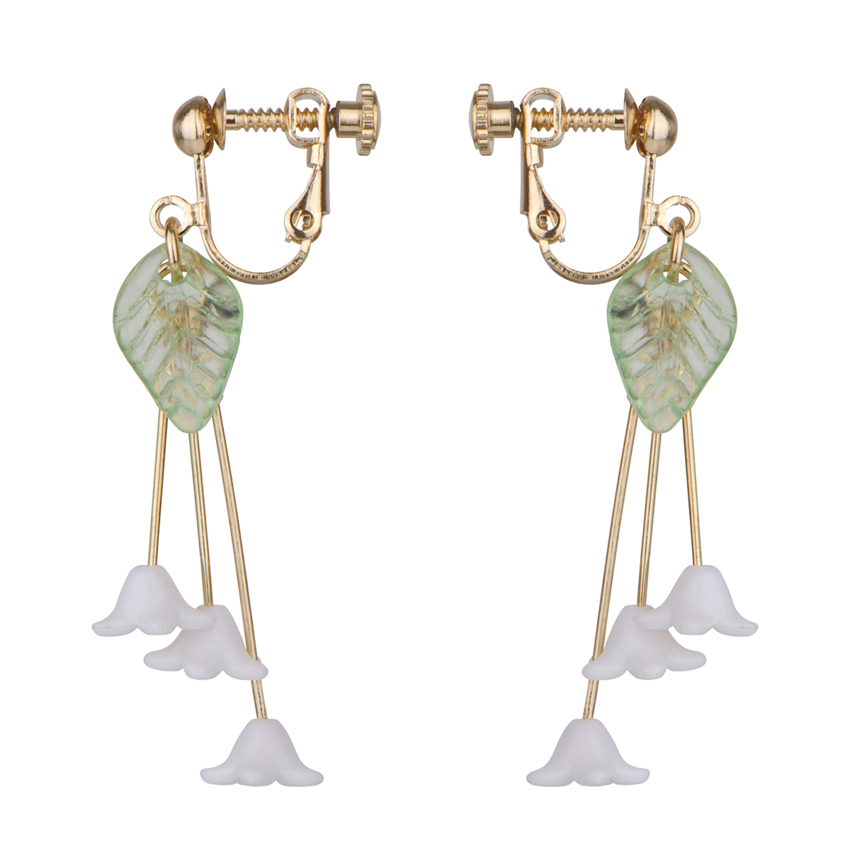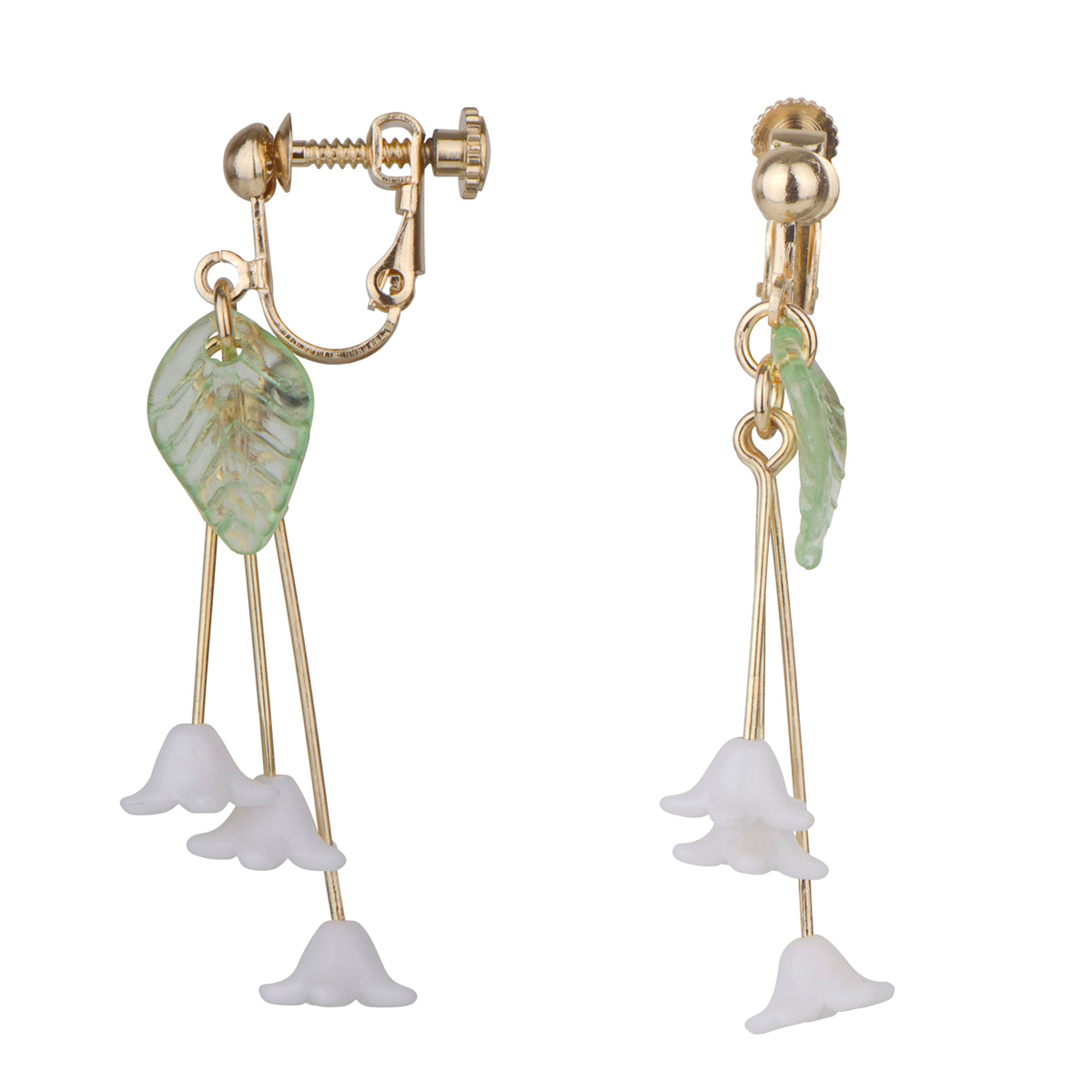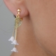 - Dangle Drop earrings are crafted with lightweight alloy metal plated in gold tone with cascading white acrylic flowers and a transparent leaf accent.