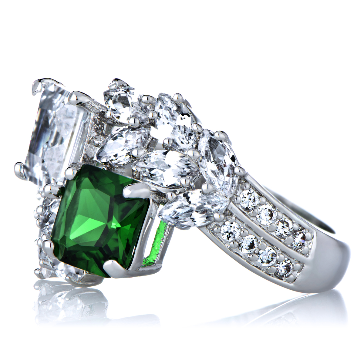 Our Simulated diamond replica features a brass base, Silver tone design that features stunning emerald and clear princess cut stones that measure 1 carat each.