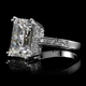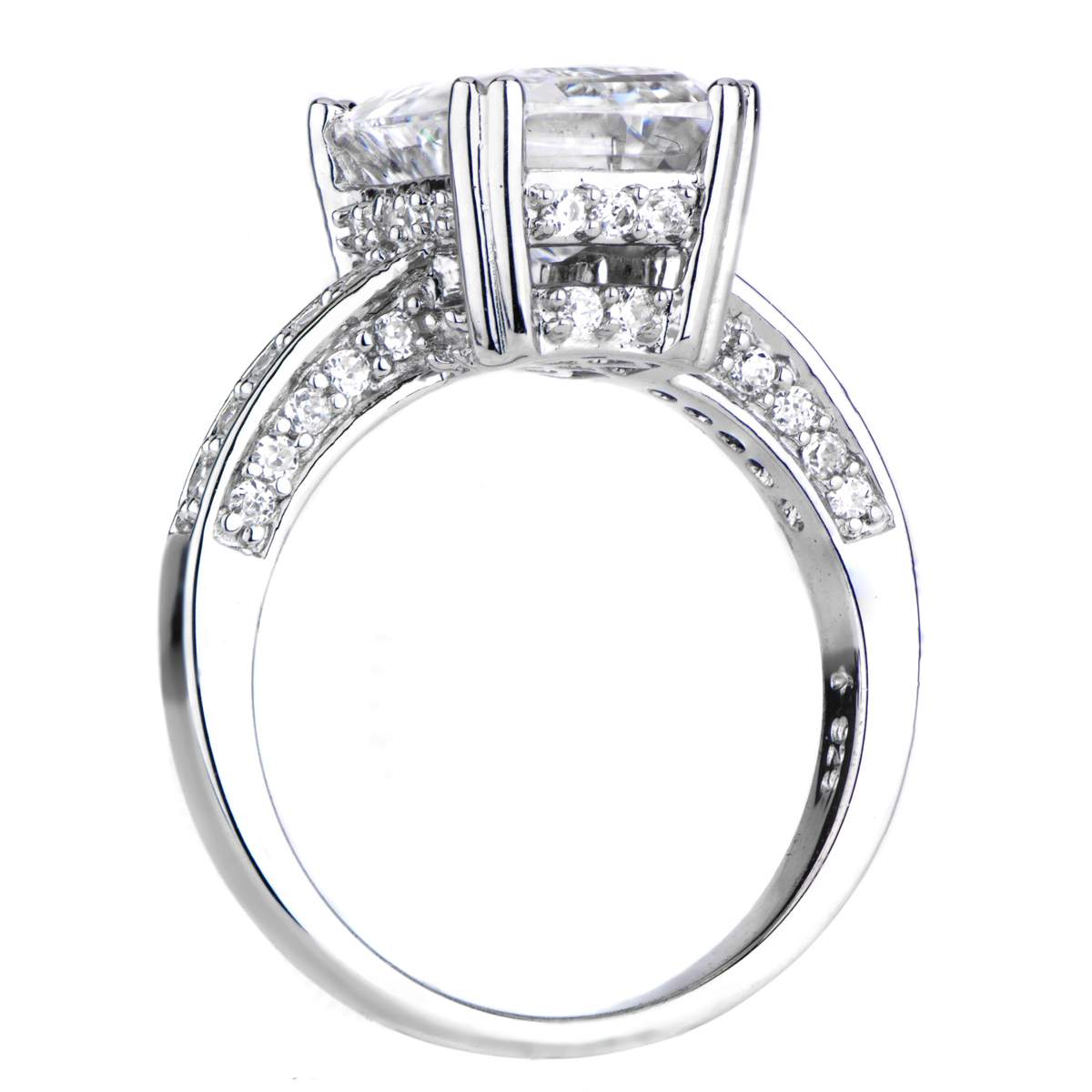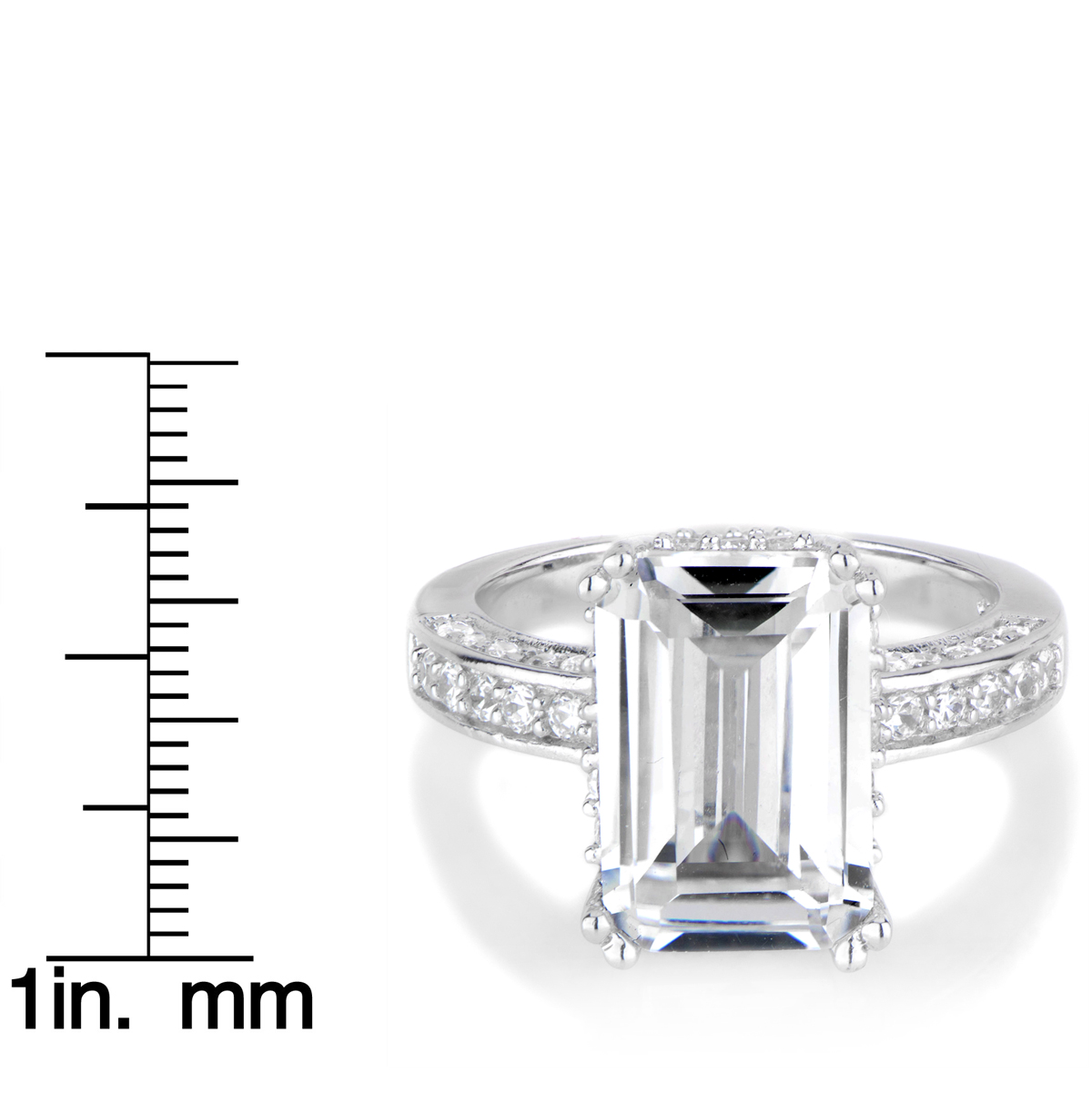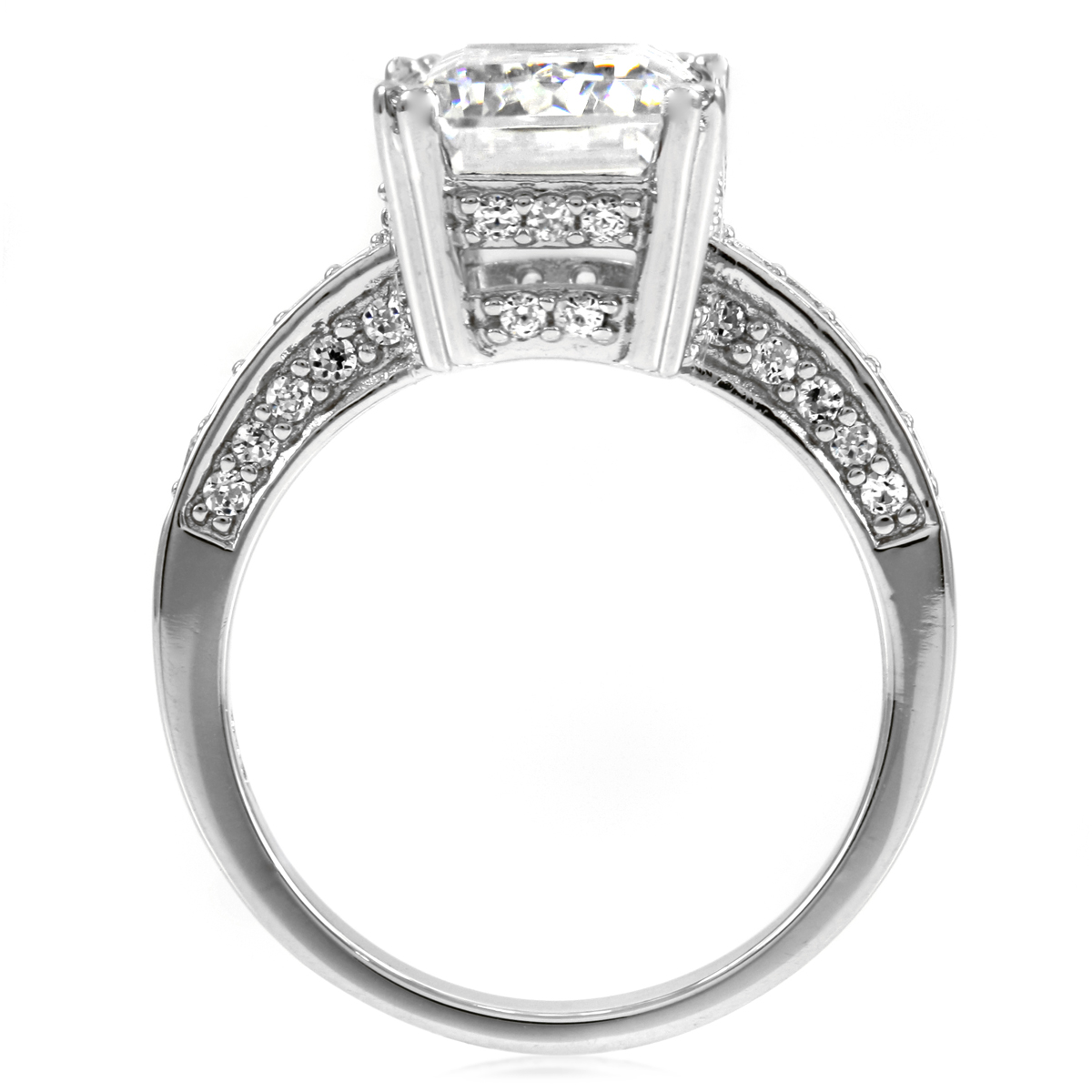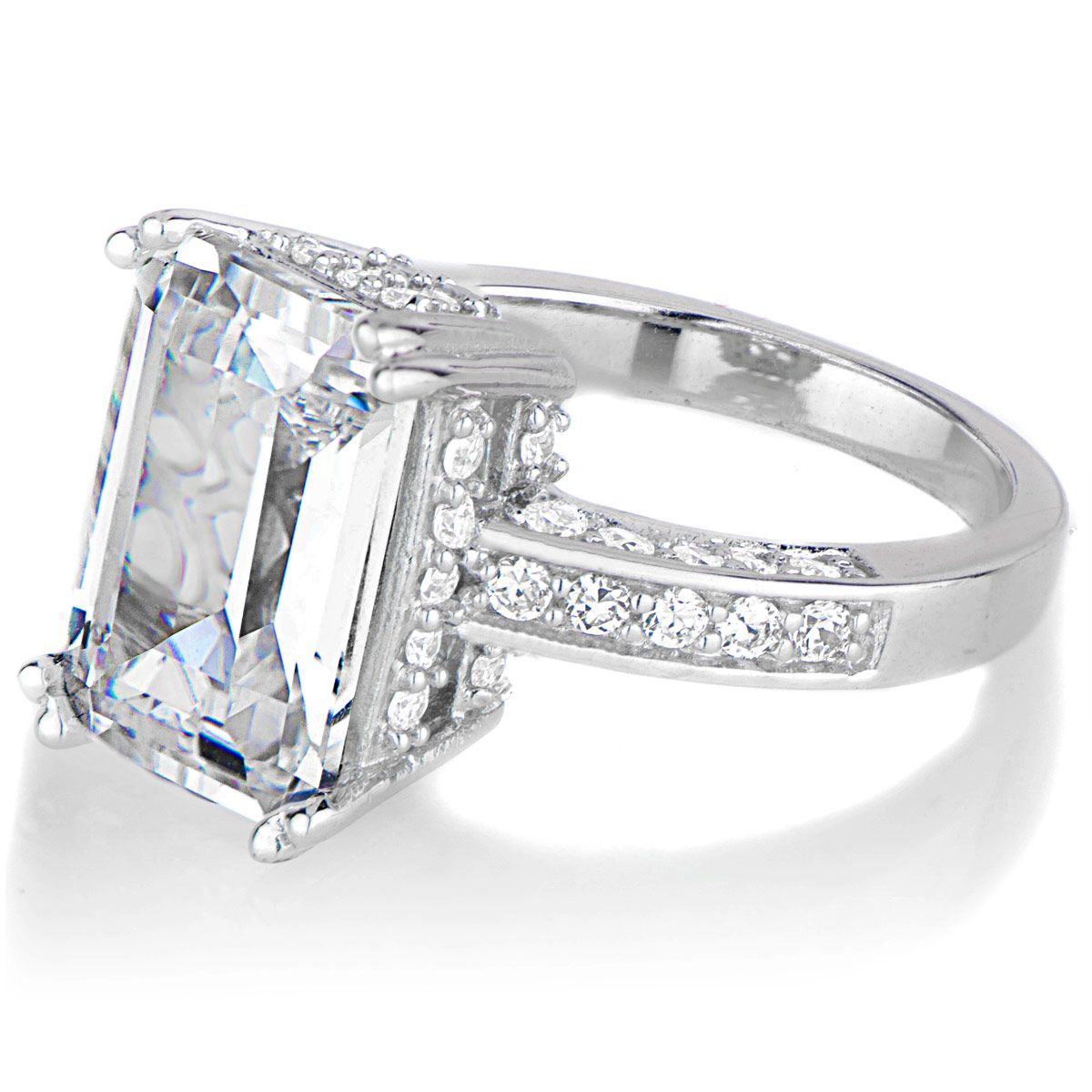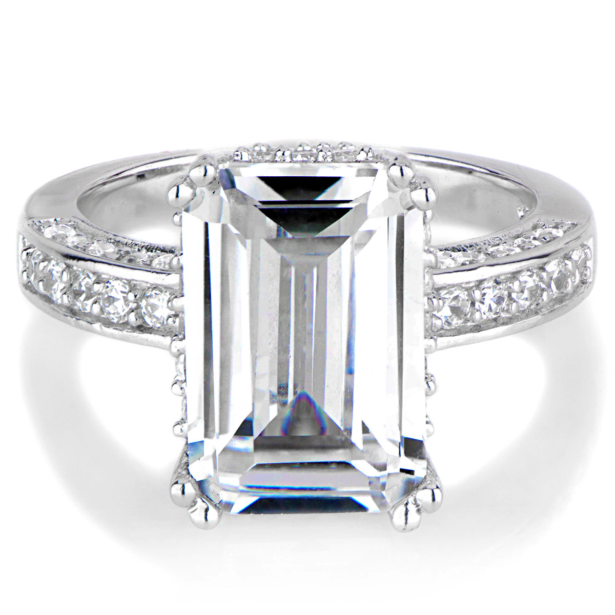 - Elegant engagement ring with emerald step cut center stone. This ring features cubic zirconia stones and is made of sterling silver.