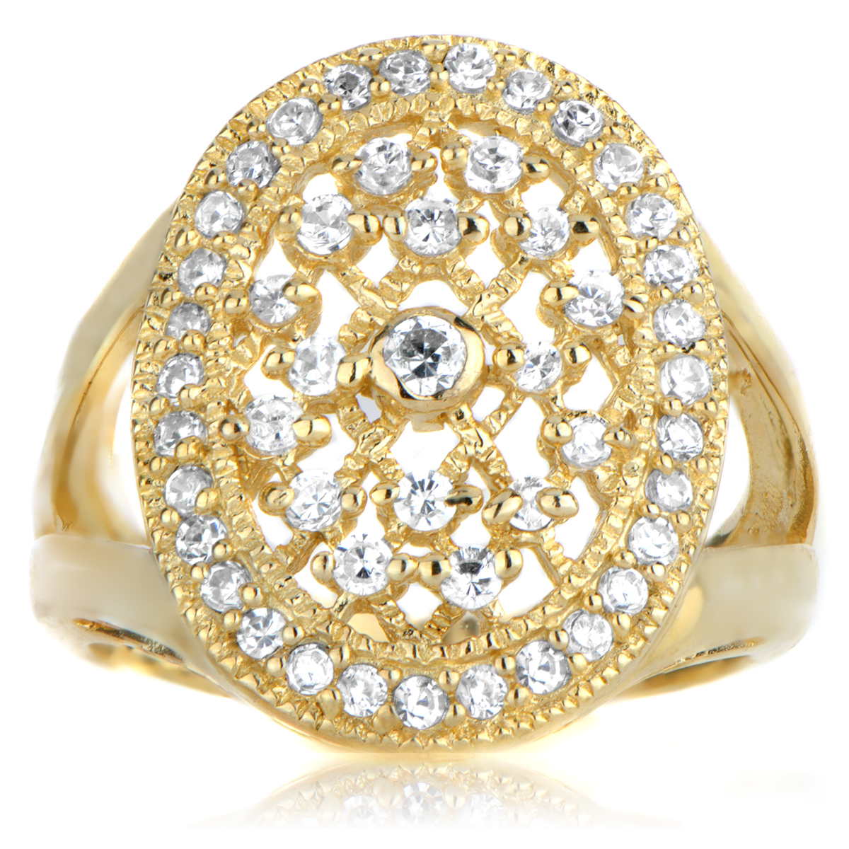 - Face of the ring is a long oval, set with slanting rows of glittering round stones.