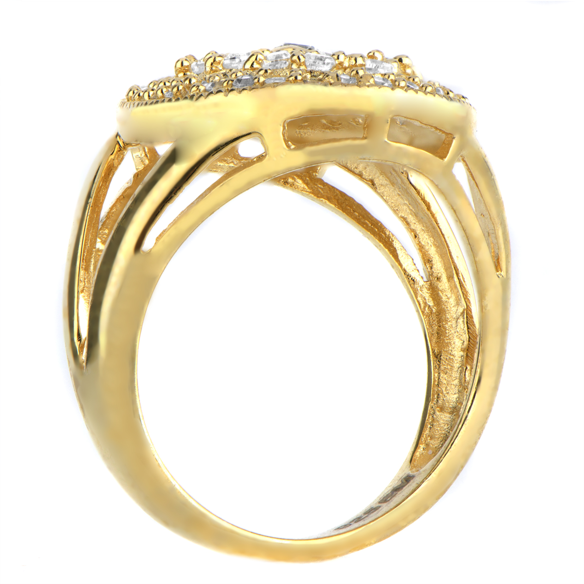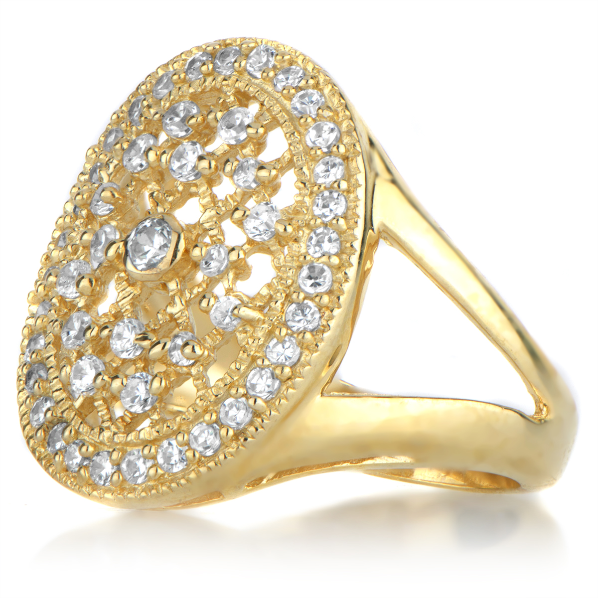 - Goldtone sterling silver forms a "fragile web" around the simulated diamonds and surrounds the bezel set center stone.