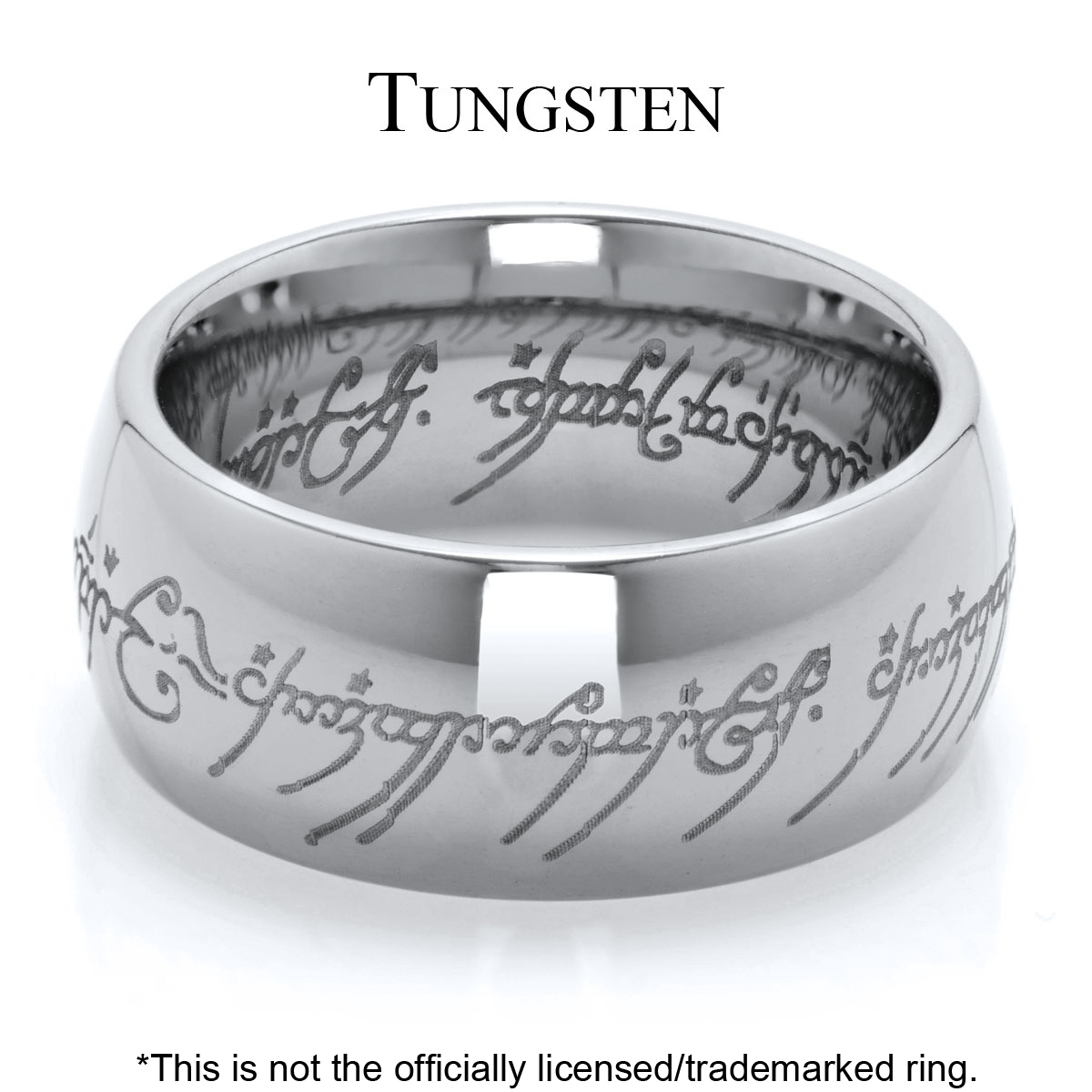 Otherworldly tungsten carbide with Elvish script design. The silvertone men�s ring is made of cobalt free, tungsten carbide metal.