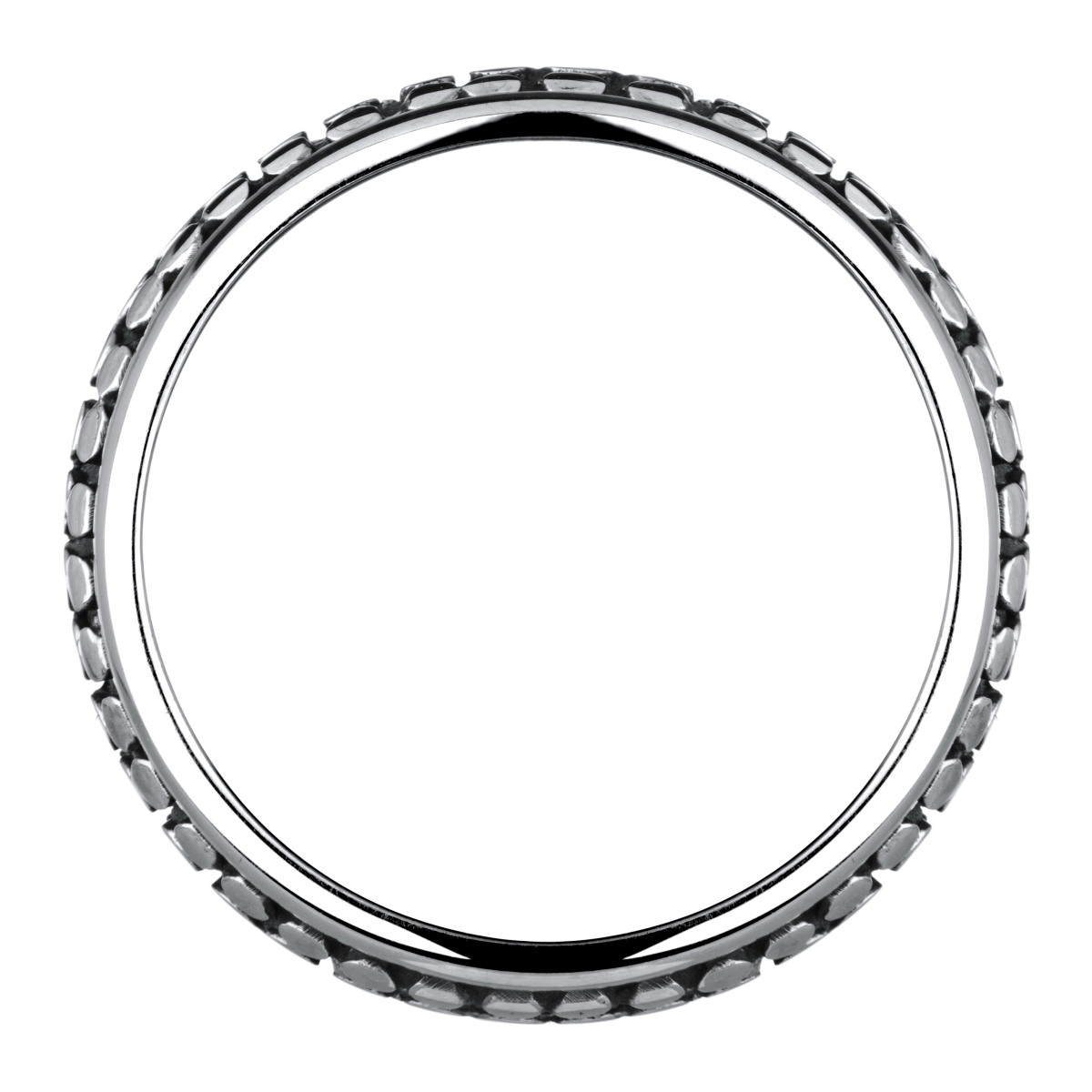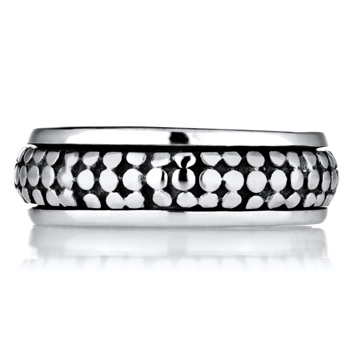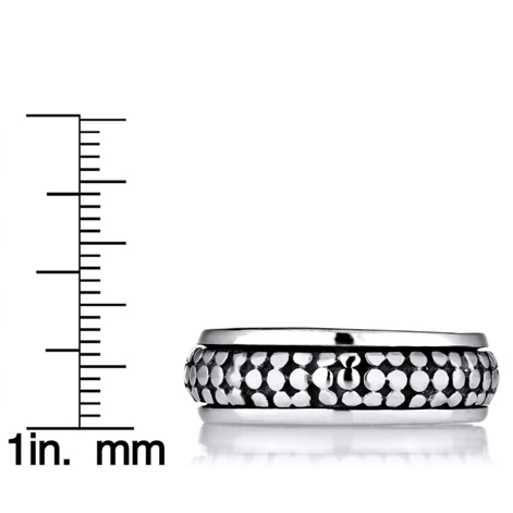 - The .925 sterling silver ring features a unique spinning and etched design.