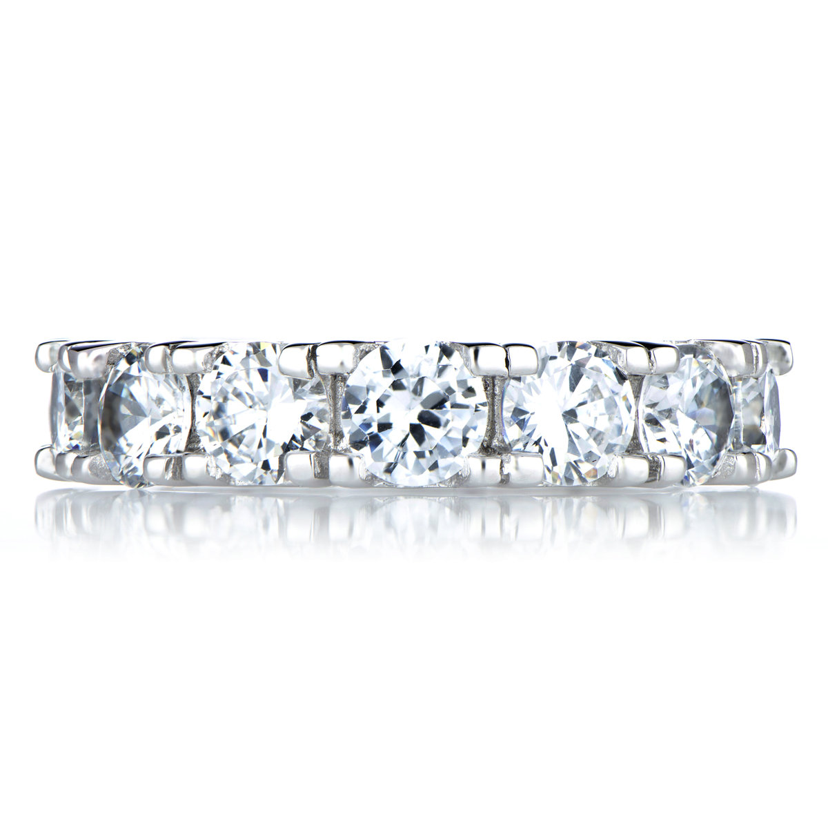 - Elegant eternity band ring with cubic zirconia stones. Stones are set on a sterling silver band.