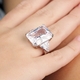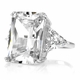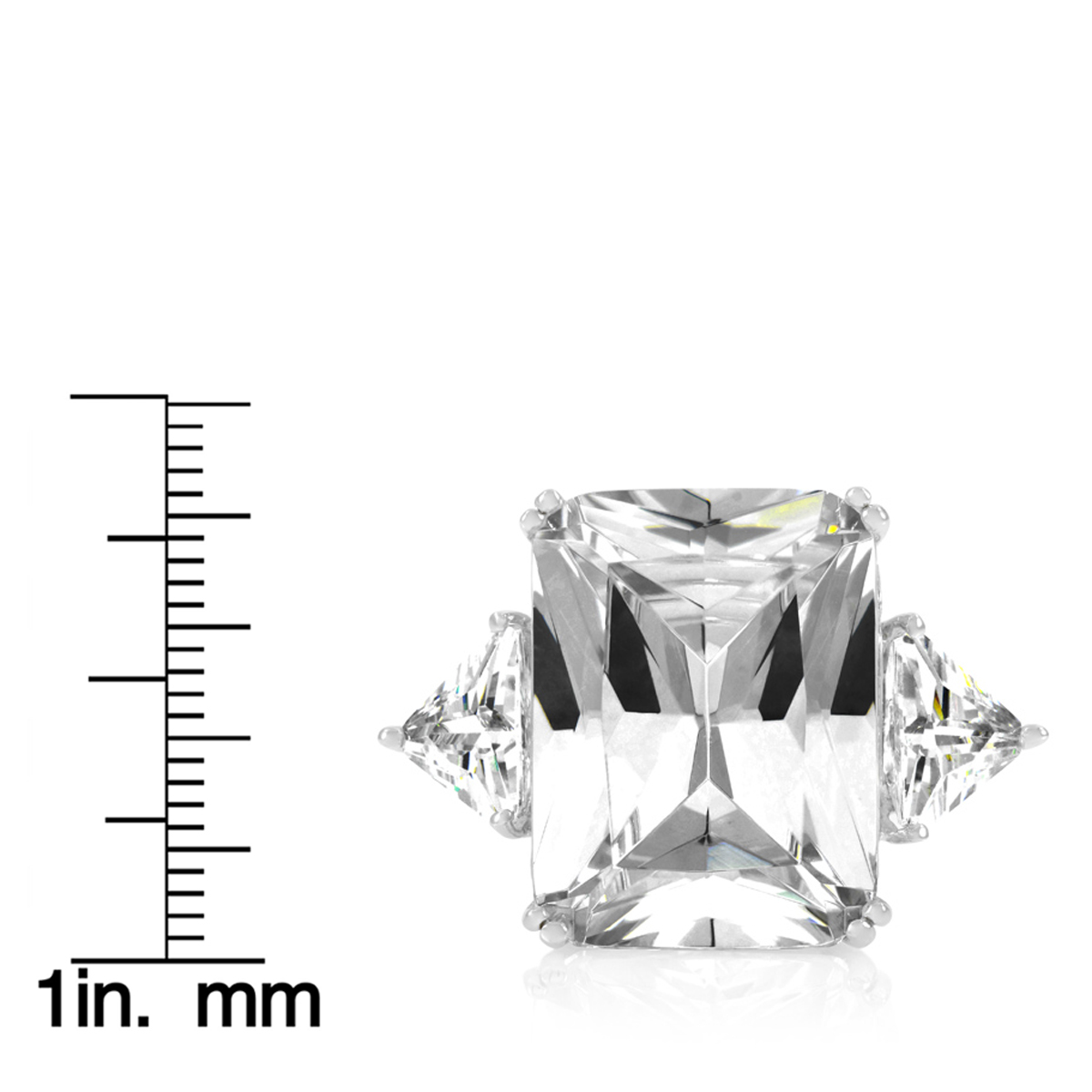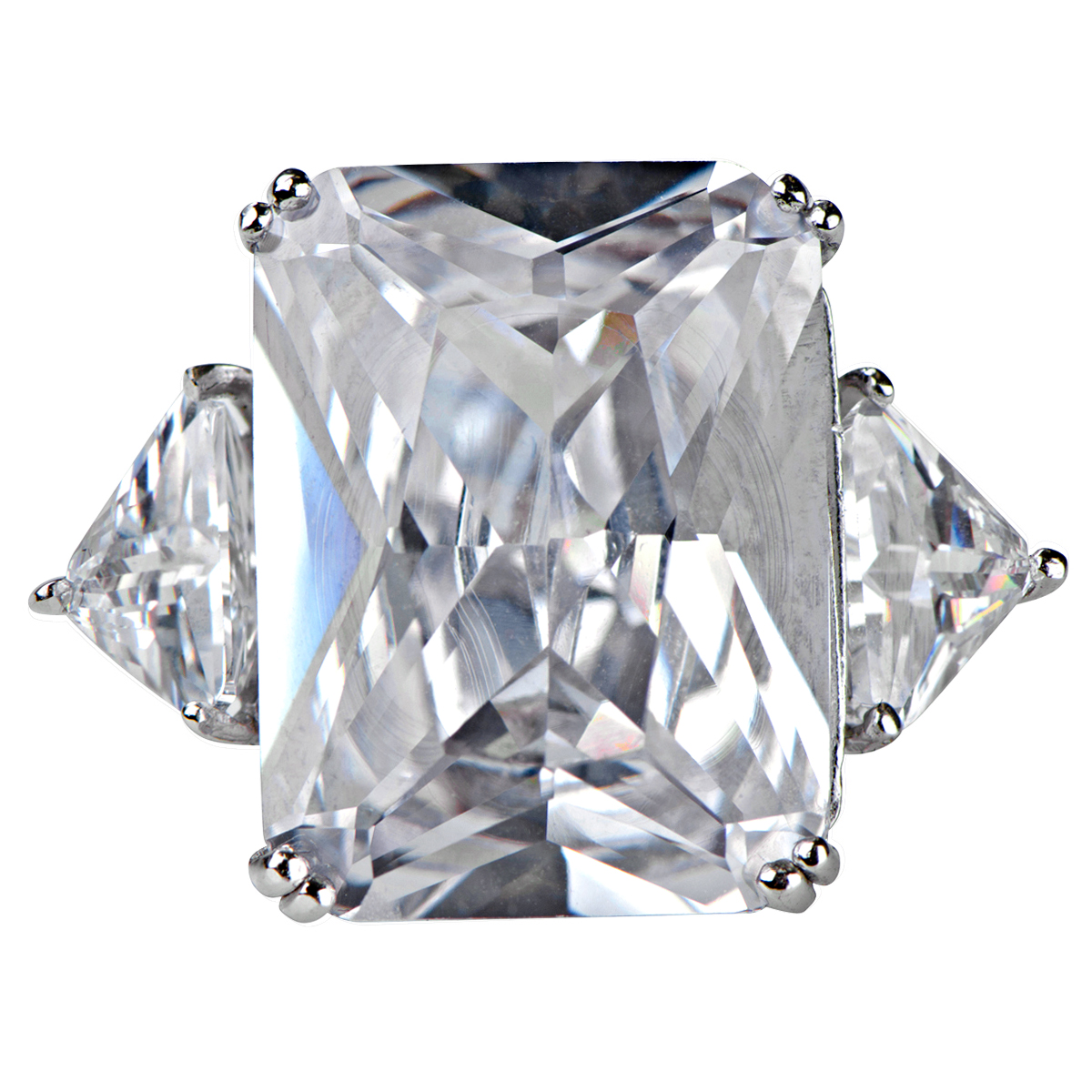 - Celebrity-style design reminiscent of a Hollywood royalty ring. The center stone is emerald cut and flanked by two triangle cut stones.