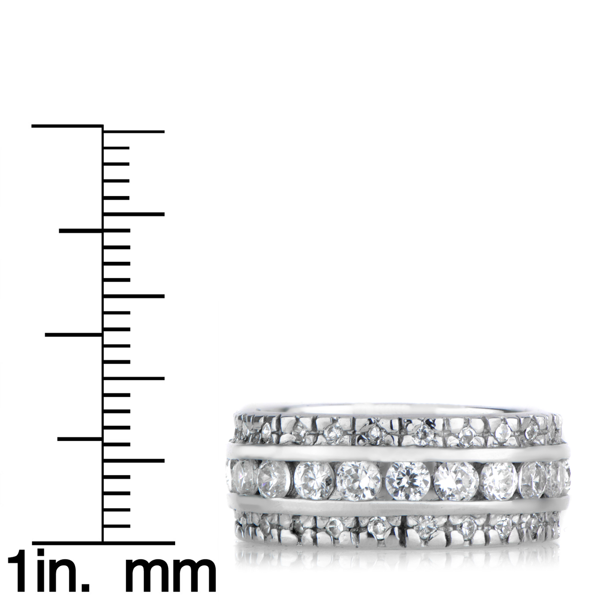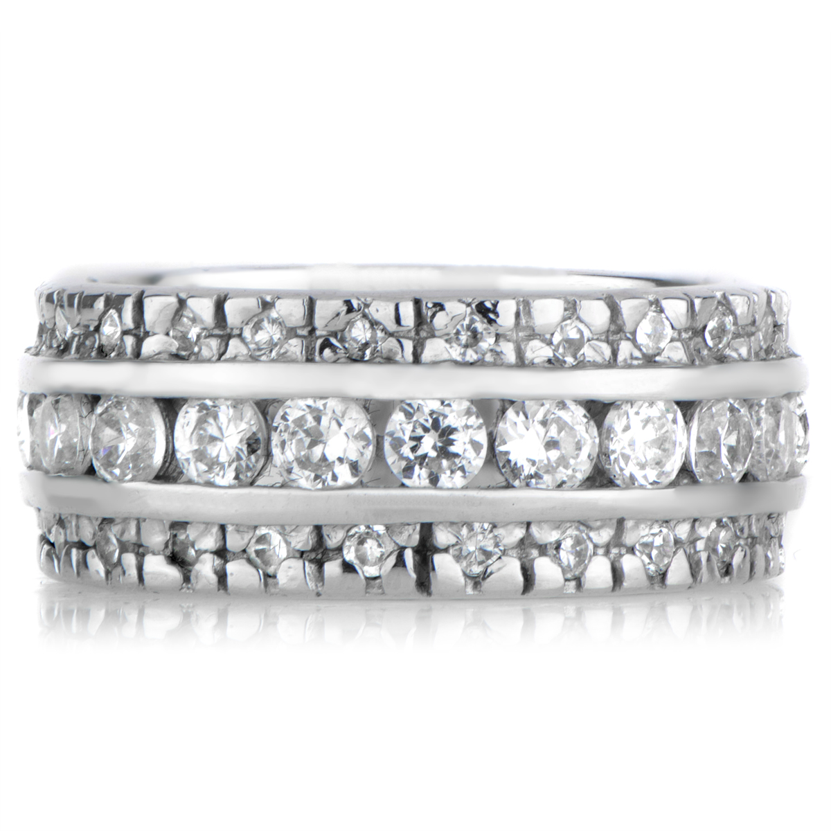 A triple row of shining, round cut cubic zirconia stones perfect for stacking and wearing solo, this sterling silver, 6.5mm thick eternity band is the perfect 'goes with anything' accessory. Featuring .06 carat channel and .01 carat prong set CZ stones.