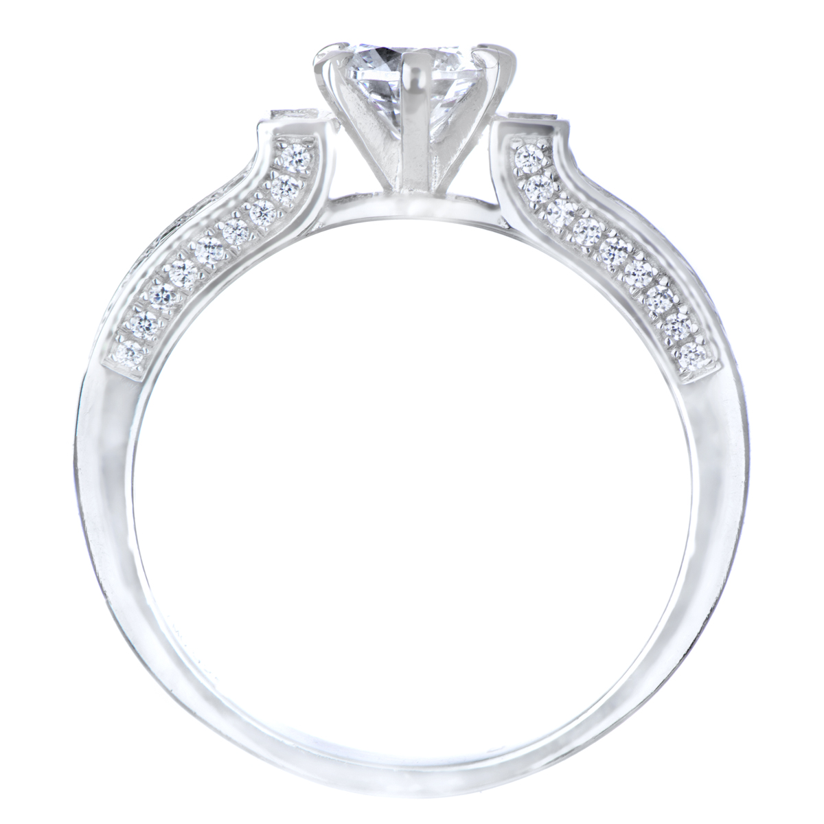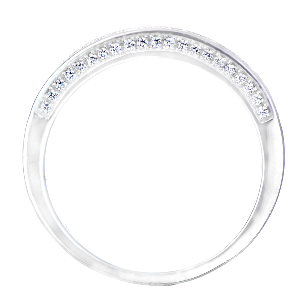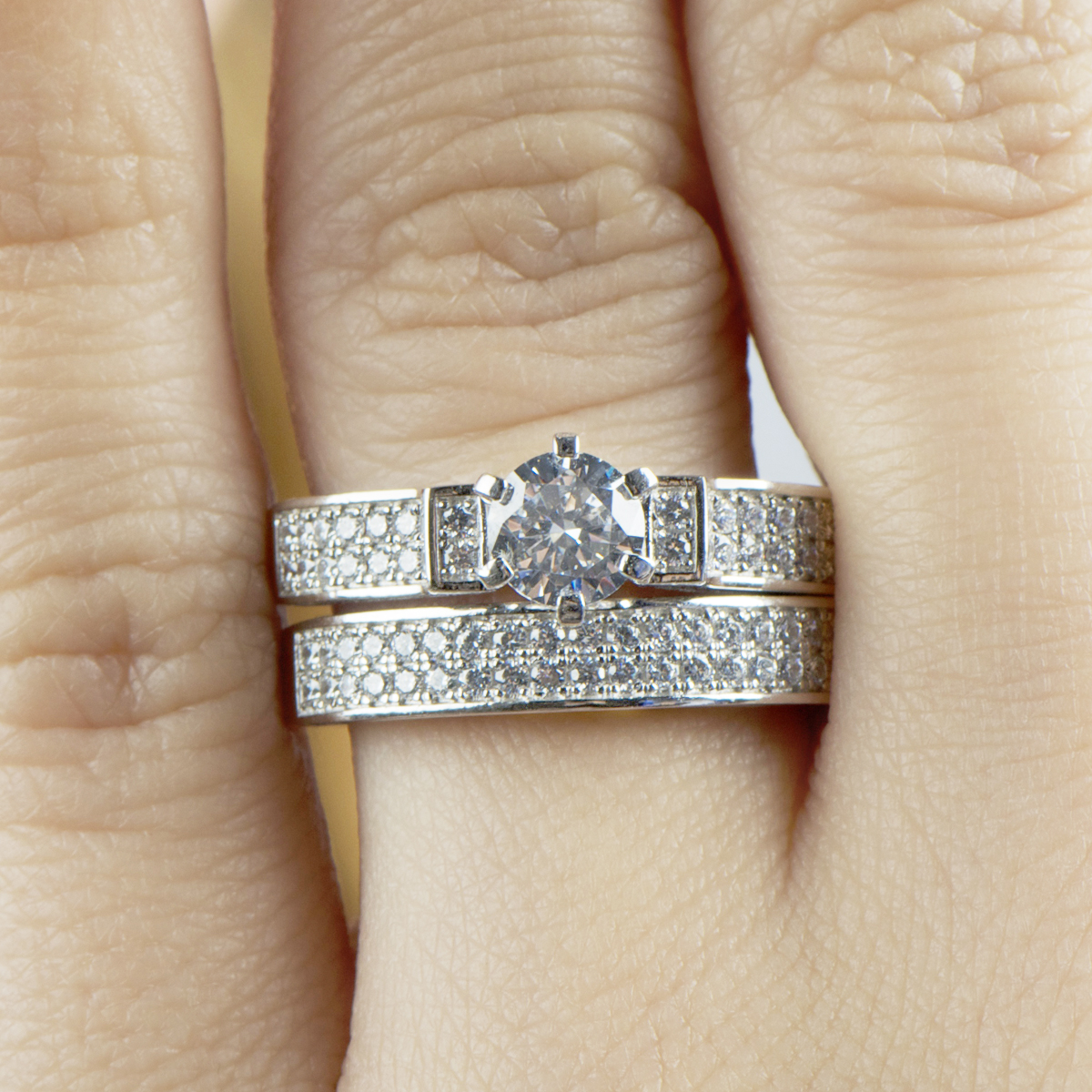 - Each ring features a 925 sterling silver design with two rows of petite size CZ stones that extend partially down the band.