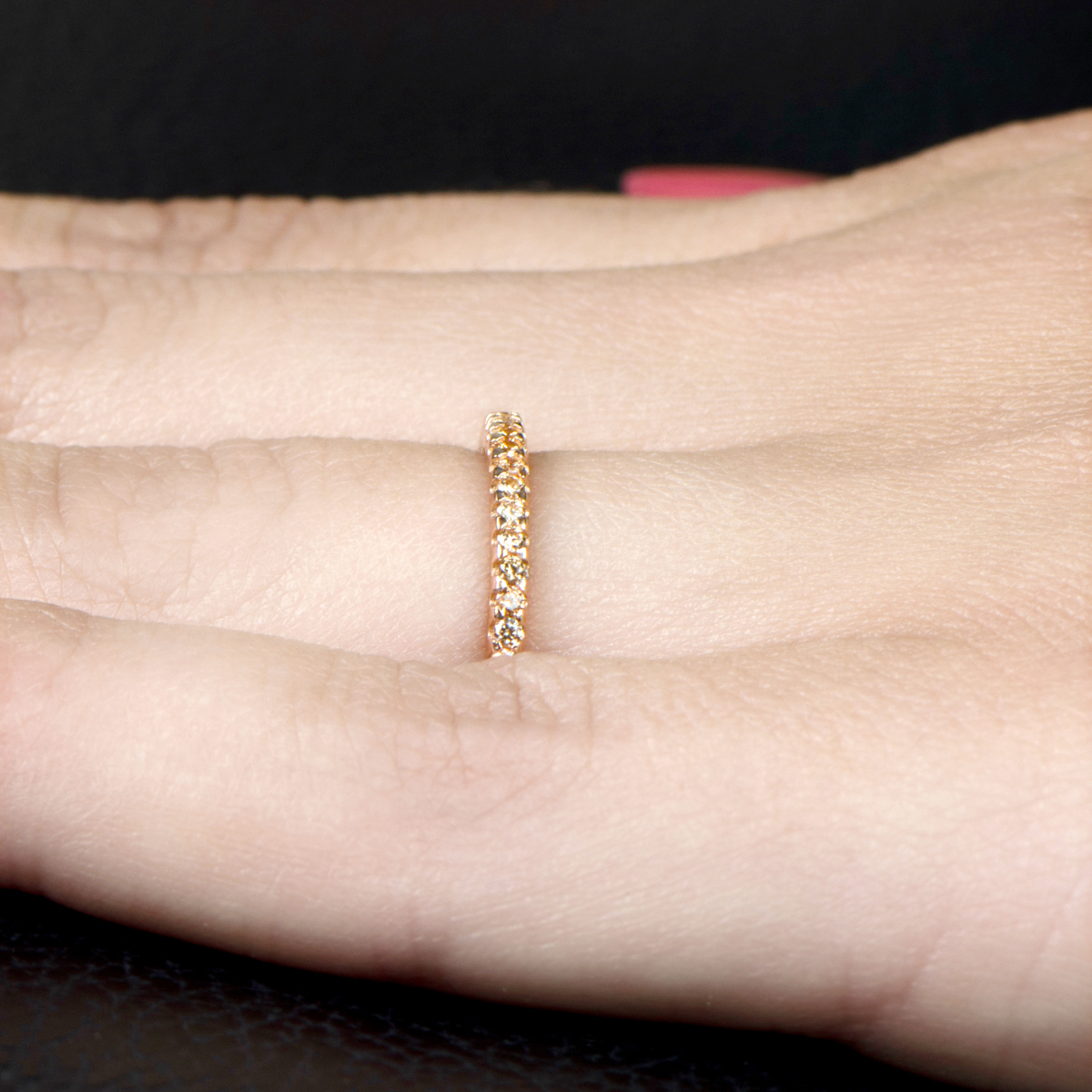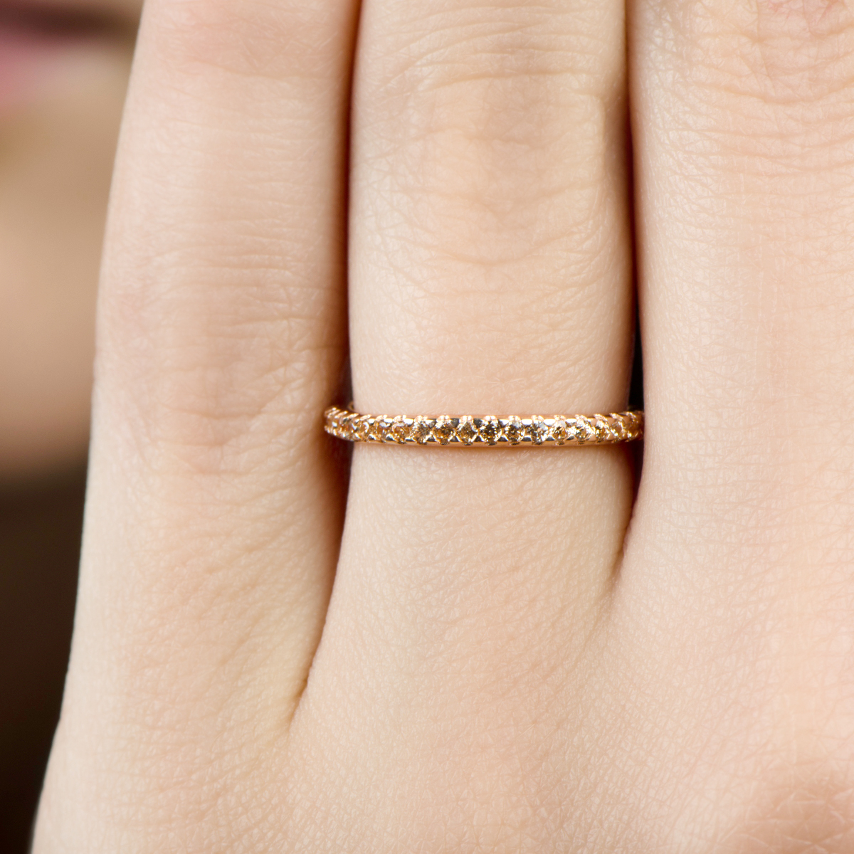 - Thin band is accented with small prong set stones that extend all the way around the ring.