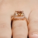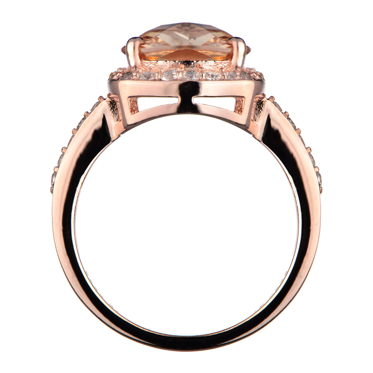 - Features a stunning peach cushion cut CZ stone that measures 3.87 carats and is surrounded by smaller petite CZs creating a beautiful halo effect.