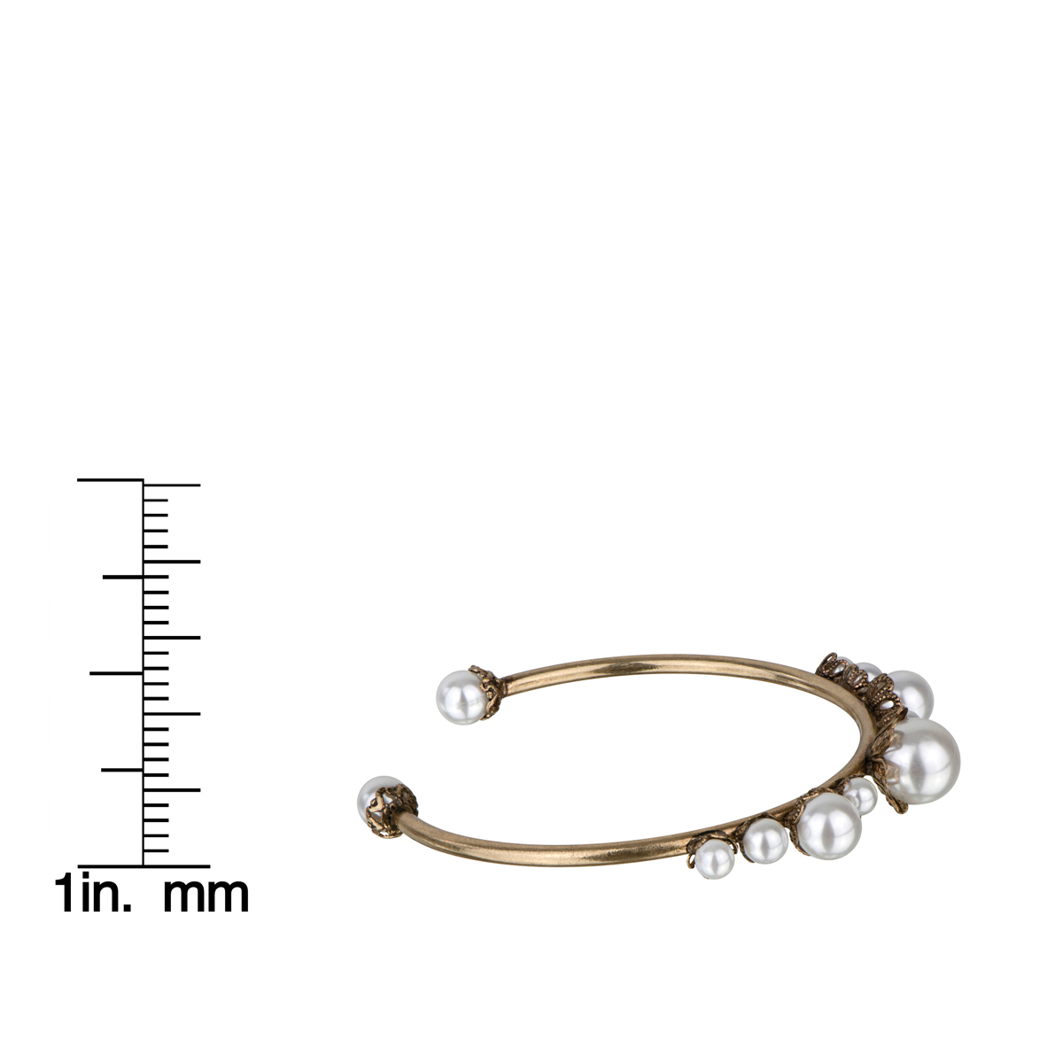 - This pearl bangle bracelet measures approx 7.5 inches and is made with pliable zinc alloy and plated with an antique goldtone finish.