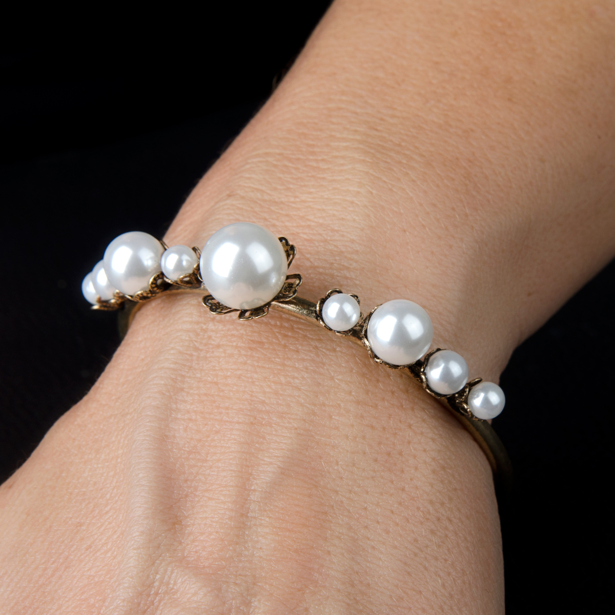- Stylish antique adjustable goldtone bangle bracelet with luminous faux pearls.