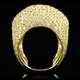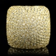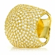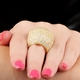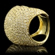 - Bold cocktail ring with pave set stones. Round cut stones are featured throughout the large curved design of this ring.