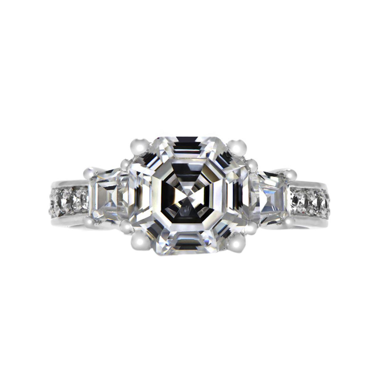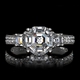 | Cut: | Center stone is Asscher inspired cut, Side stones are baguette cut, stones in band are round cut |