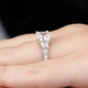 Saraya's Engagement Ring - 3 Stone Asscher Cut CZ helps you to show pure glamour with an Asscher inspired, cubic zirconia sterling silver ring. This fake diamond engagement ring features two prong set baguette stones that lead the eye to a dazzling 2.5 carat asscher-like center. The nickel-free band features 7mm of tiny round cut stones with Milgrain edging. The sterling silver setting is rhodium electroplated for the gleam of platinum. The entire ring weighs 3.9 grams.