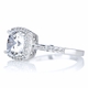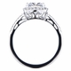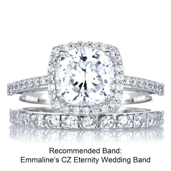- Cushion cut CZ is prong set above a border of pave set Signity CZs.