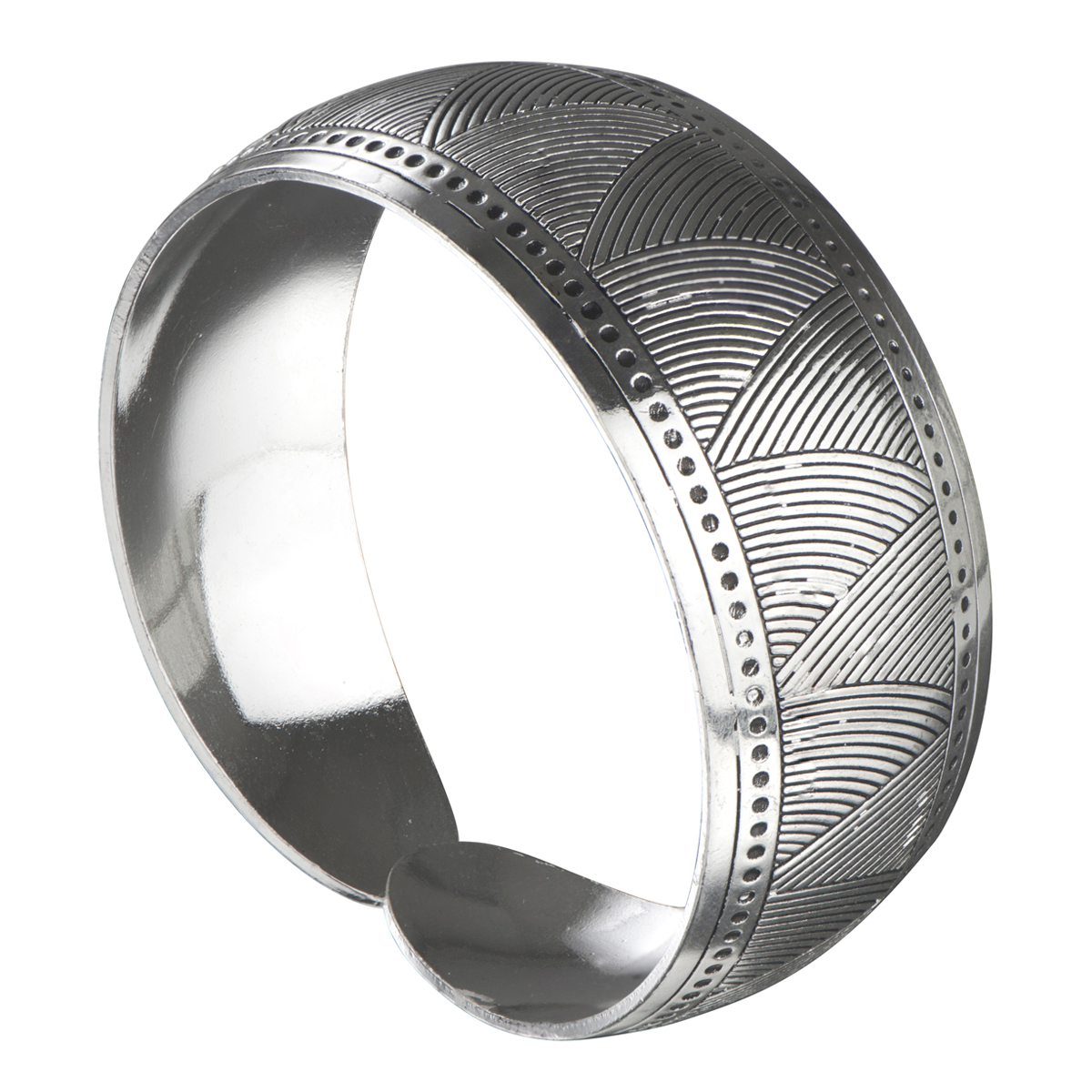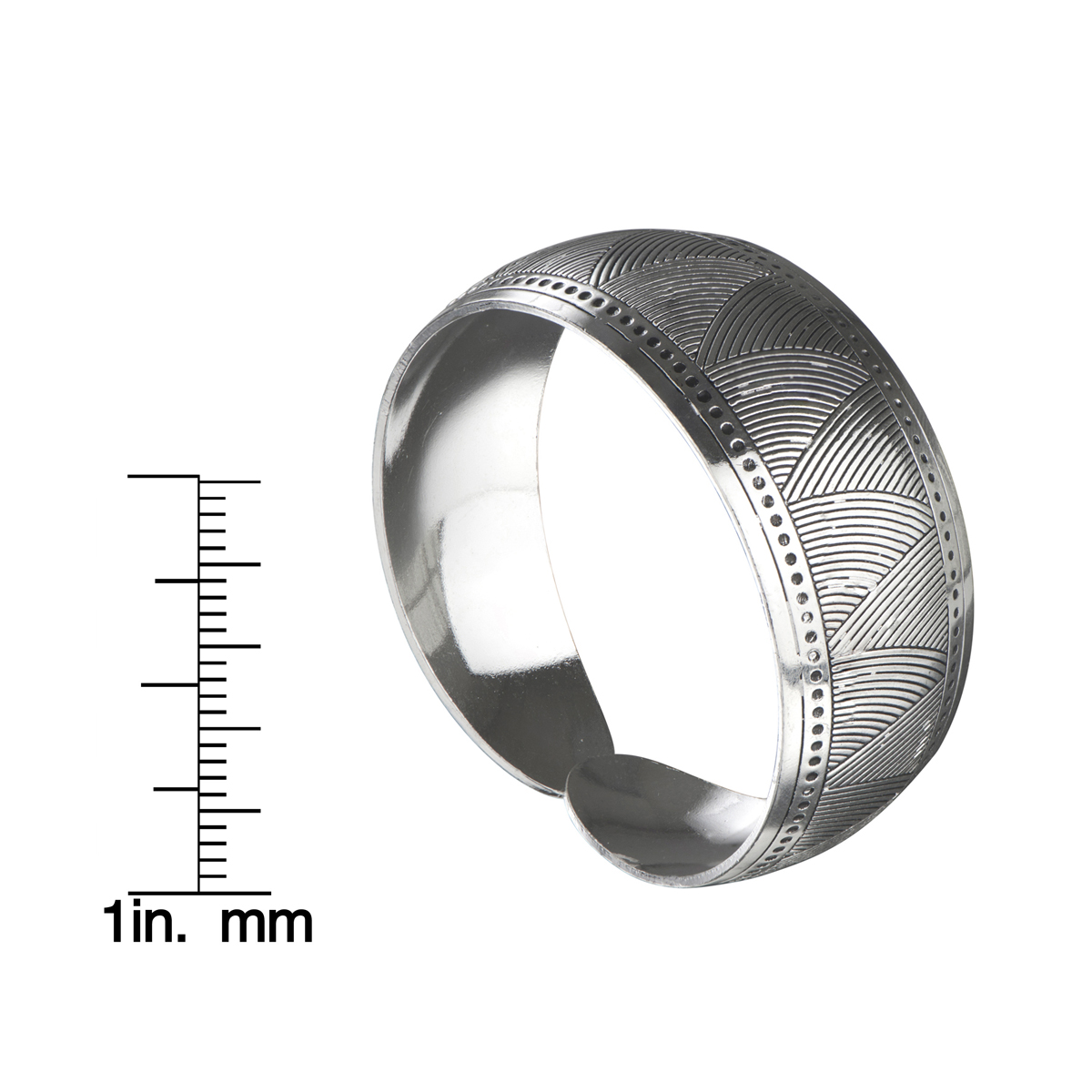 - The Silvertone Tribal pattern Bracelet measures approx. 3/4 of an inch wide and tapers in at the open end.