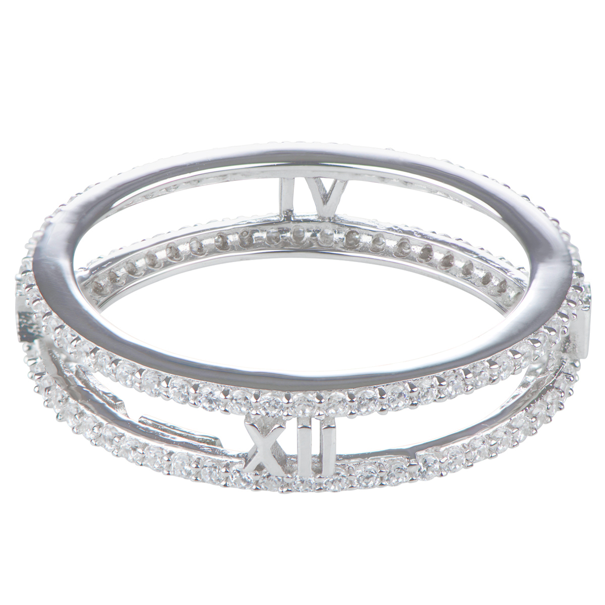 - Ring features double row with prong set cz's and silver Roman Numerals spaced evenly apart in between the bands.