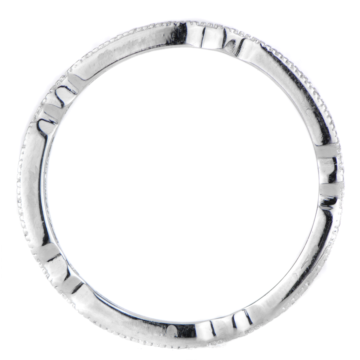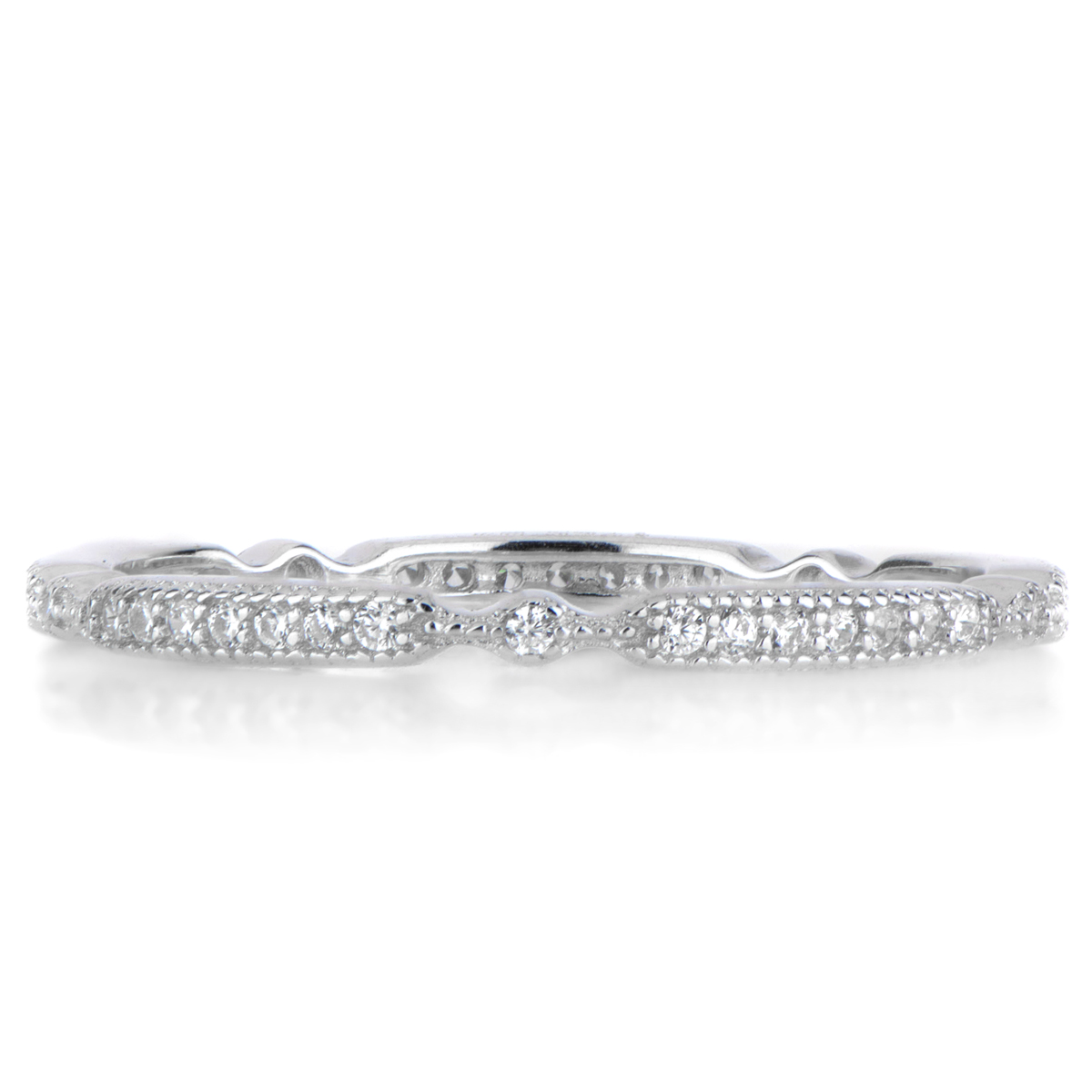 - Tiny round cut CZs line this dainty ring.