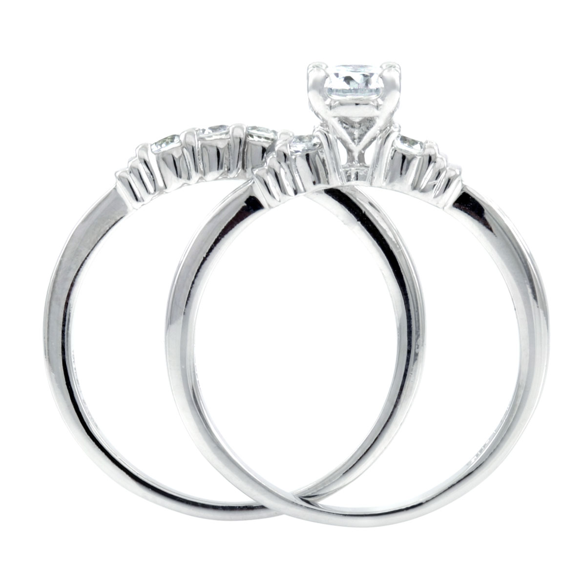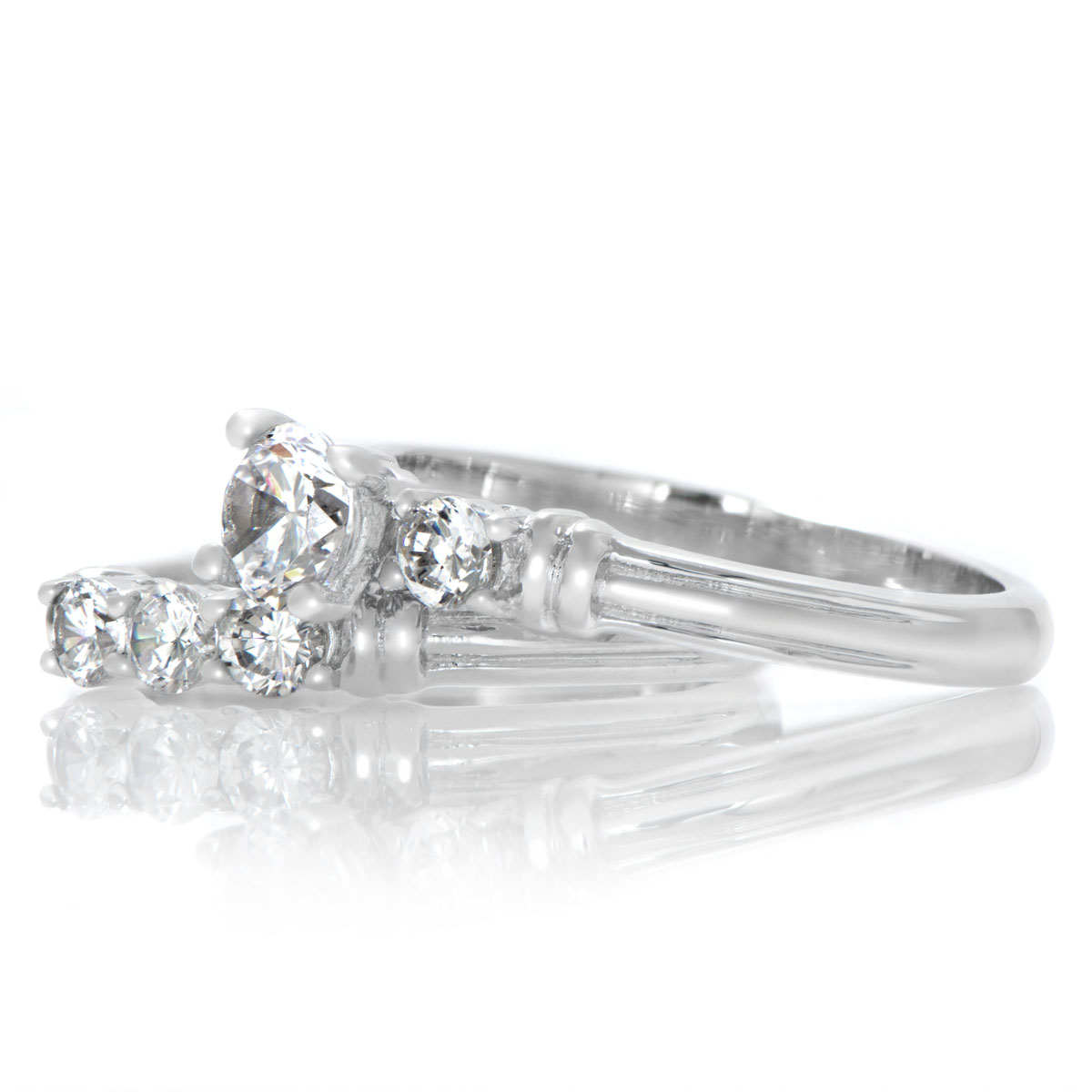 - Classic-style wedding ring set with round cut stones. The engagement ring and matching band are accented with three round cut stones at the center with the largest measuring a half-carat.