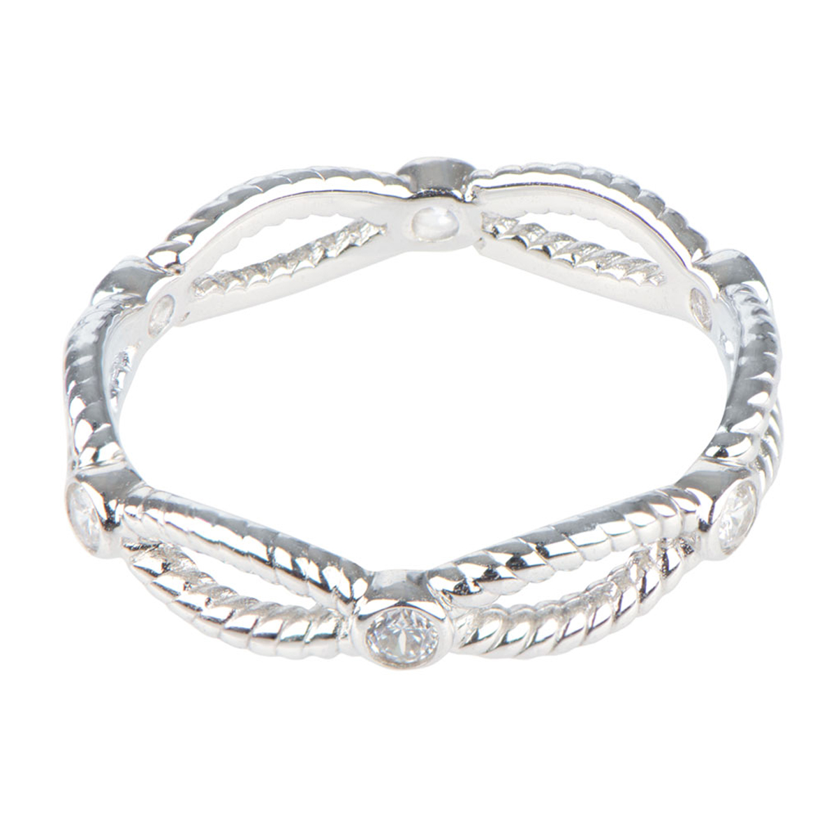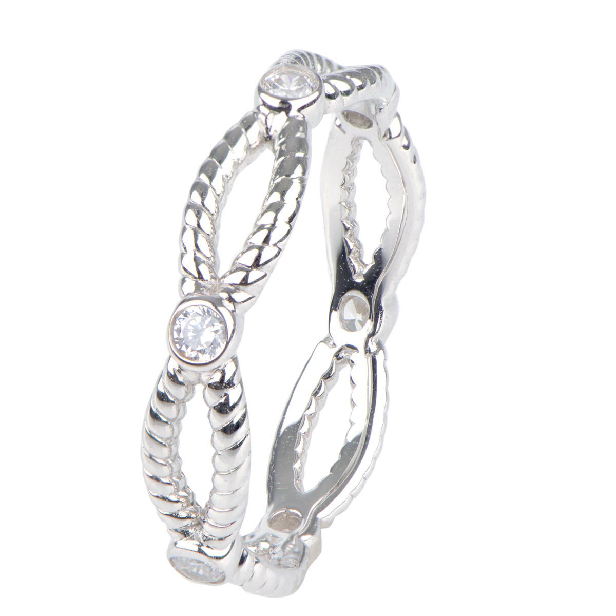 - Eternity Band features dainty twisted sterling silver accented by six .05 carat bezel set cz's.